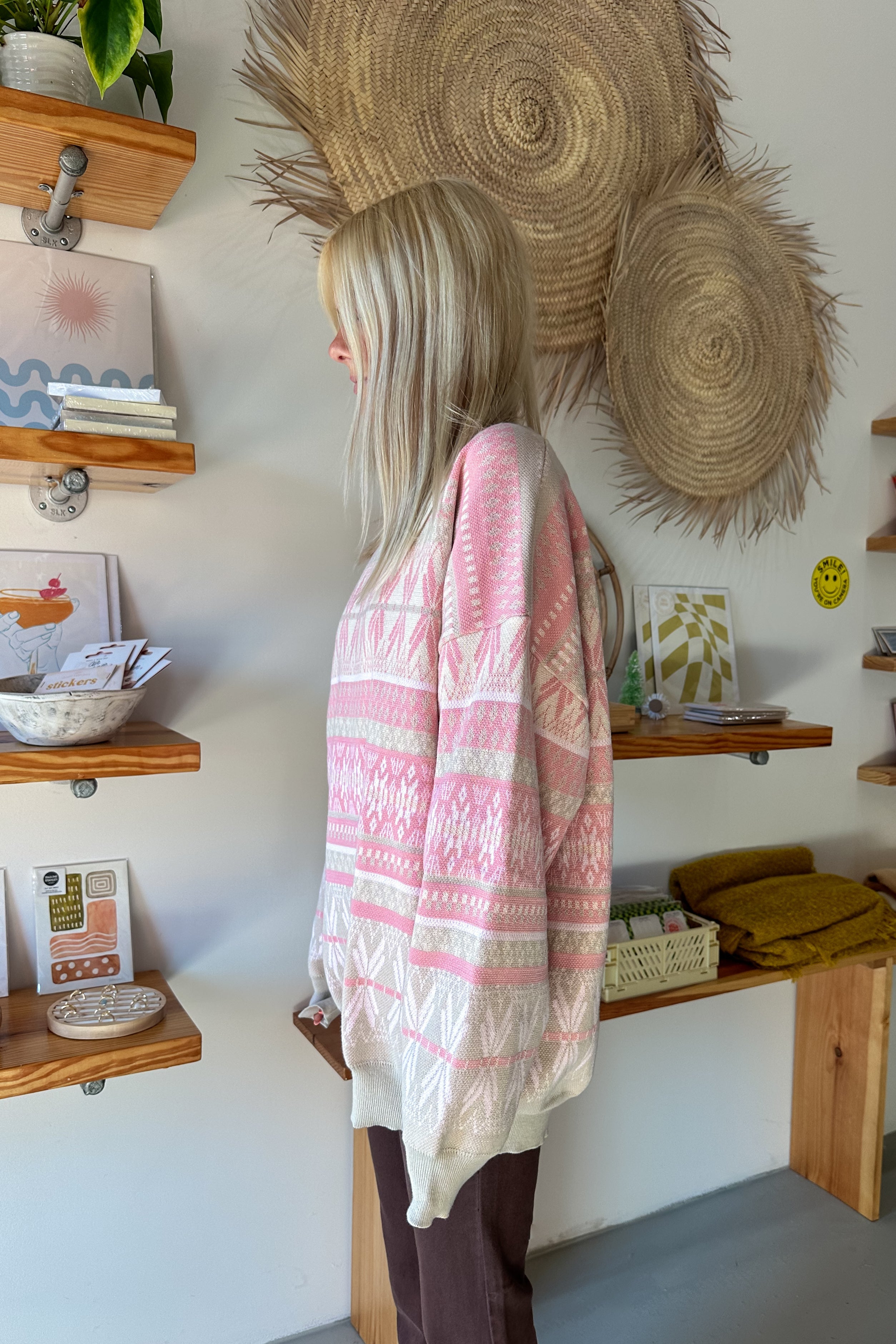 Pink, cozy patterned sweater. Size up for an oversized fit.