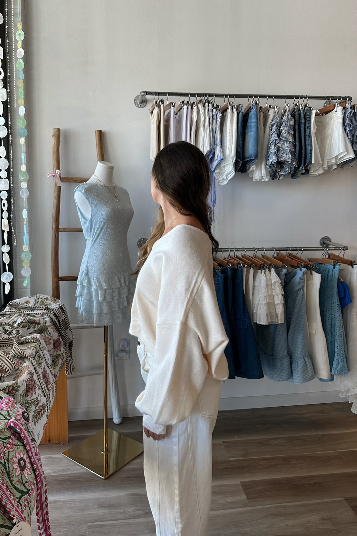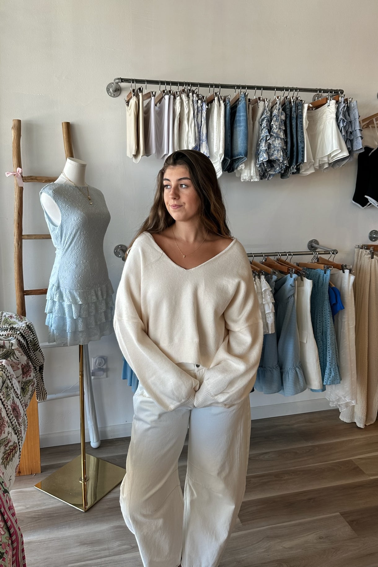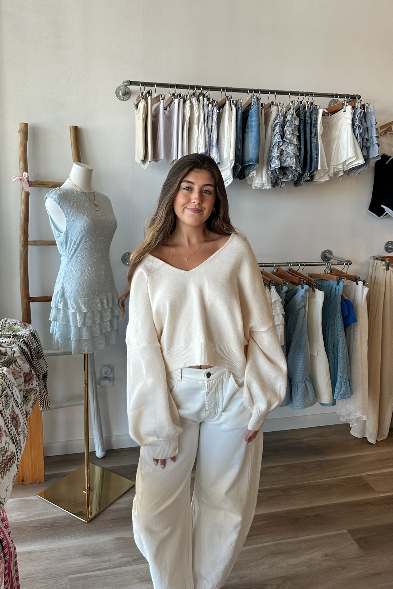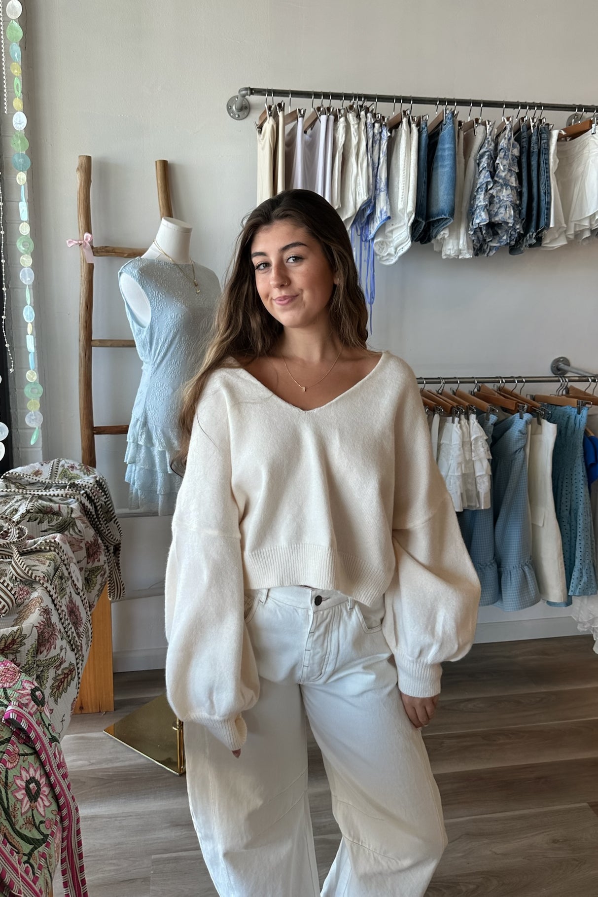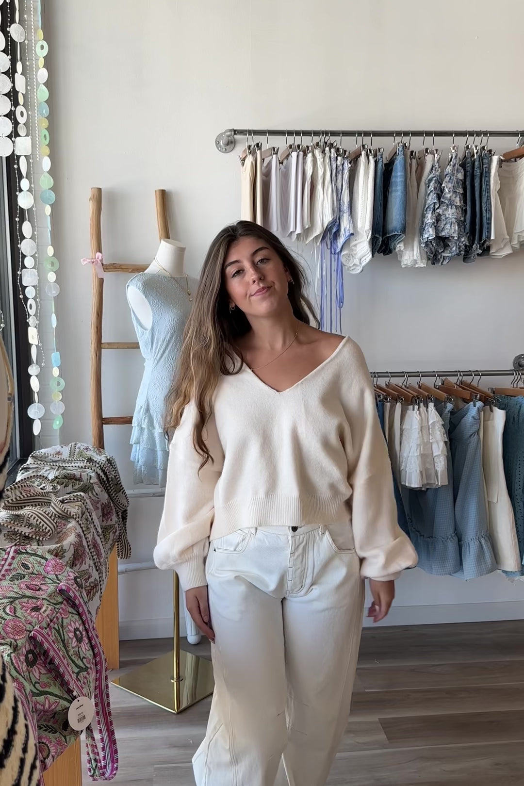 Cream, reversible cropped sweater with V-neck and puff sleeves