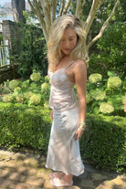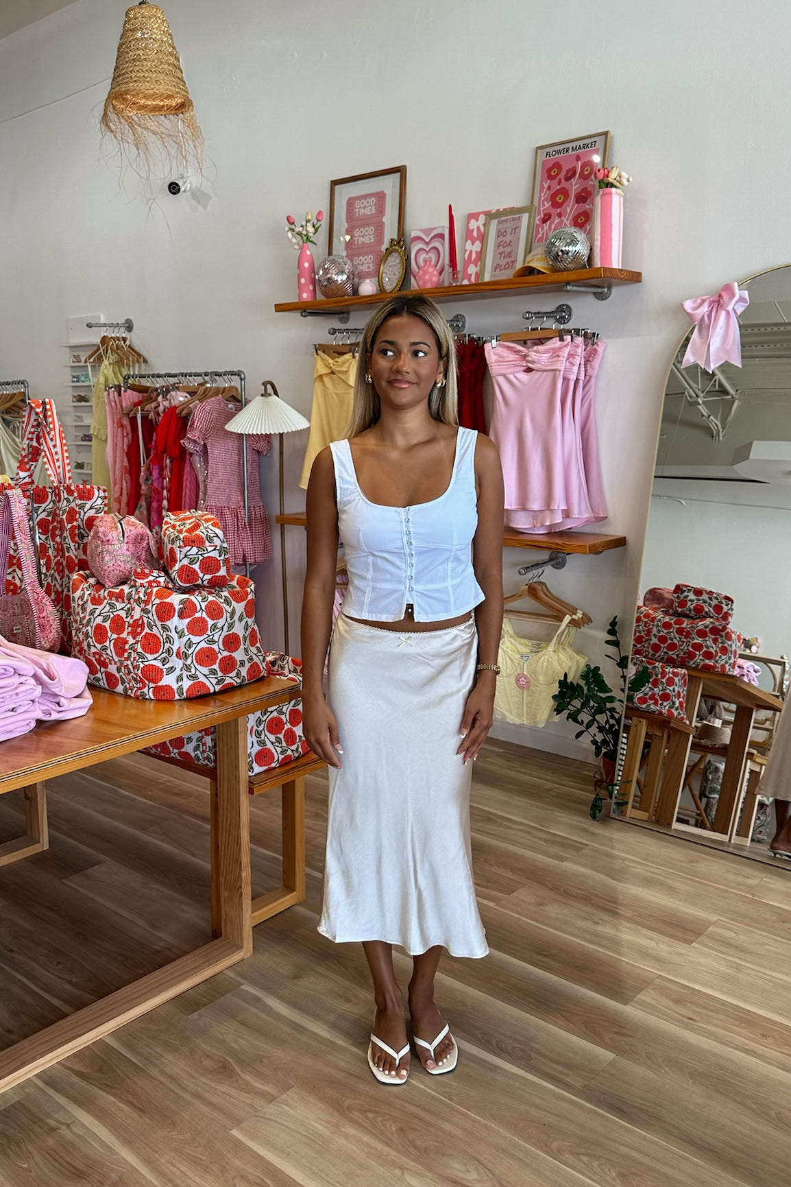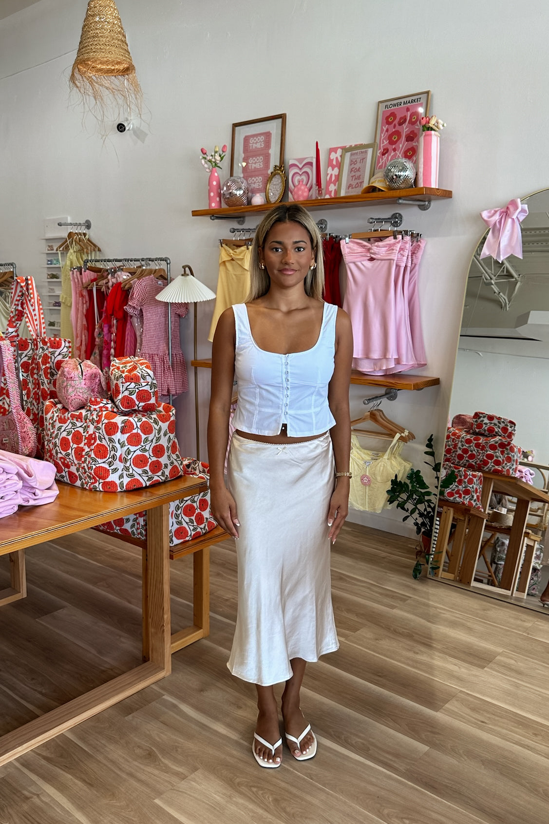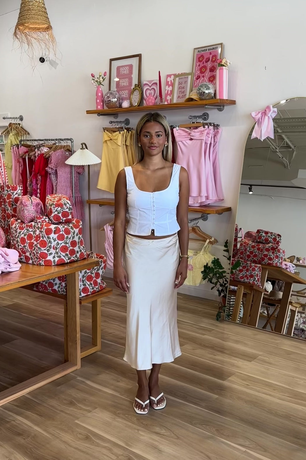 Cream, satin midi skirt with A-line cut, front bow, and scalloped edge