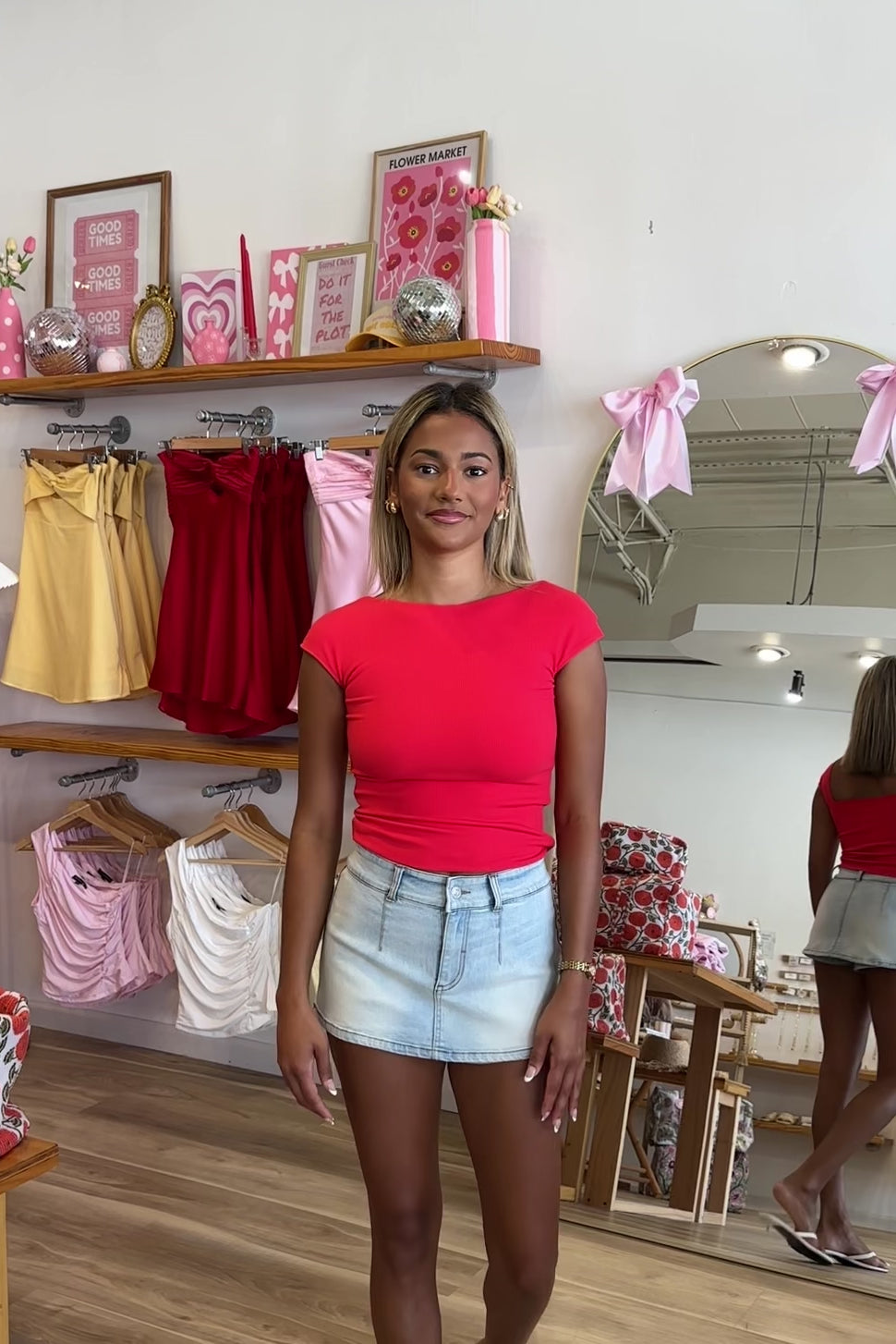 Red, boat neckline top with open back