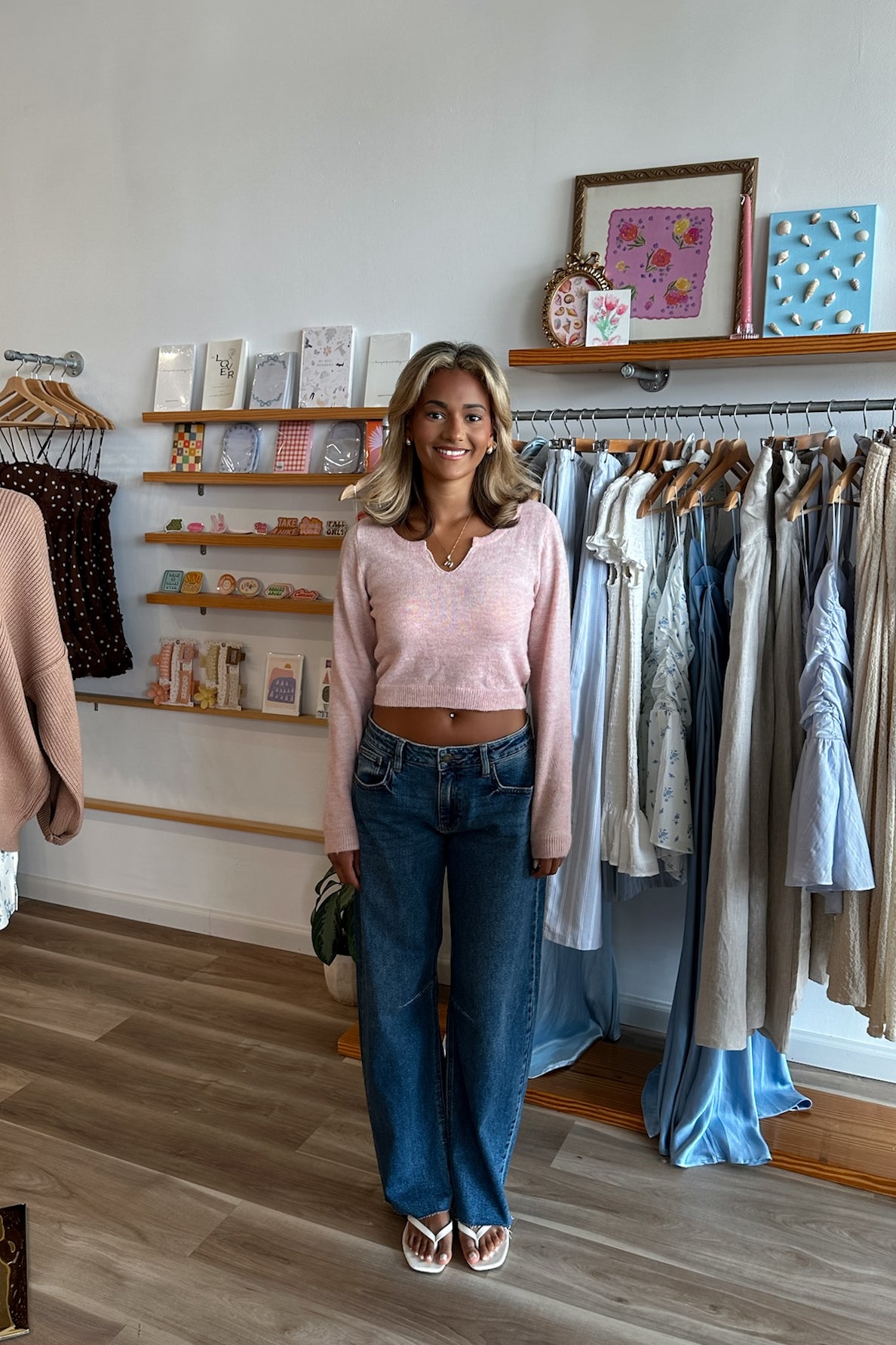 Blue, mid-rise barrel jeans with pockets and raw hem