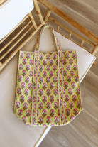 Handmade quilted tote bag with snap button closure and two inner pockets