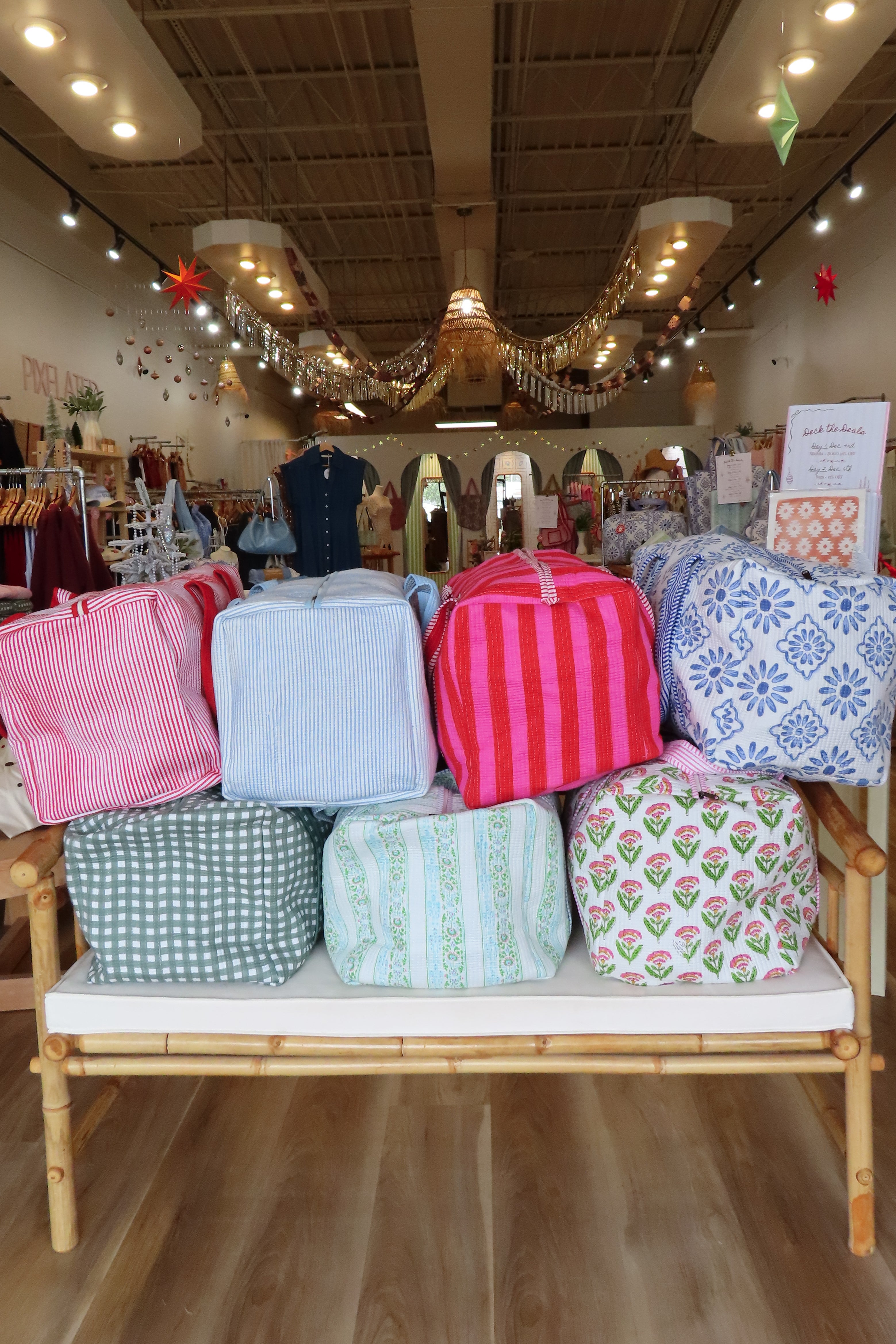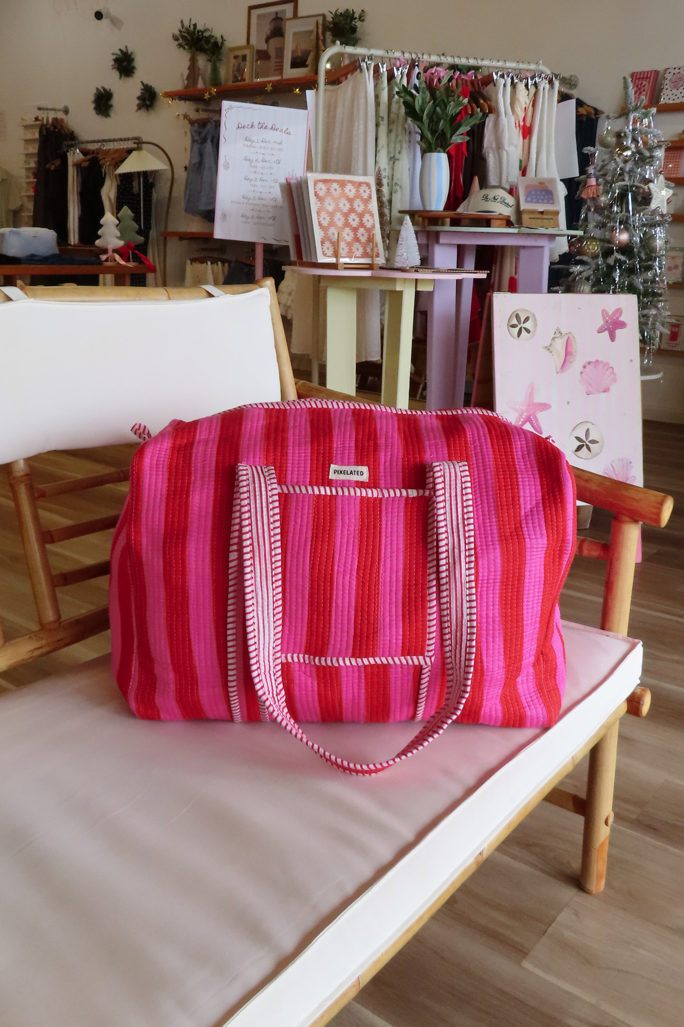 Handmade quilted duffel bag with outer pocket, zipper closure, and long shoulder straps.