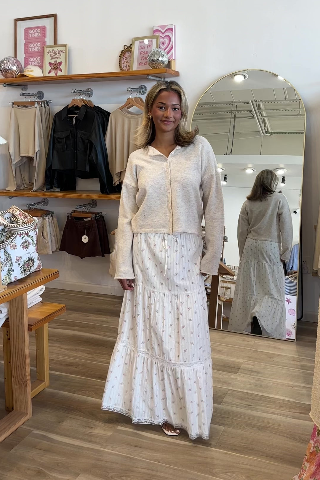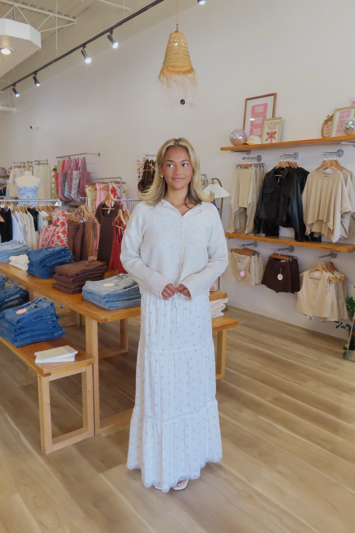 White, floral eyelet maxi skirt with lace tiers, elastic waist, drawstring tie, and lining