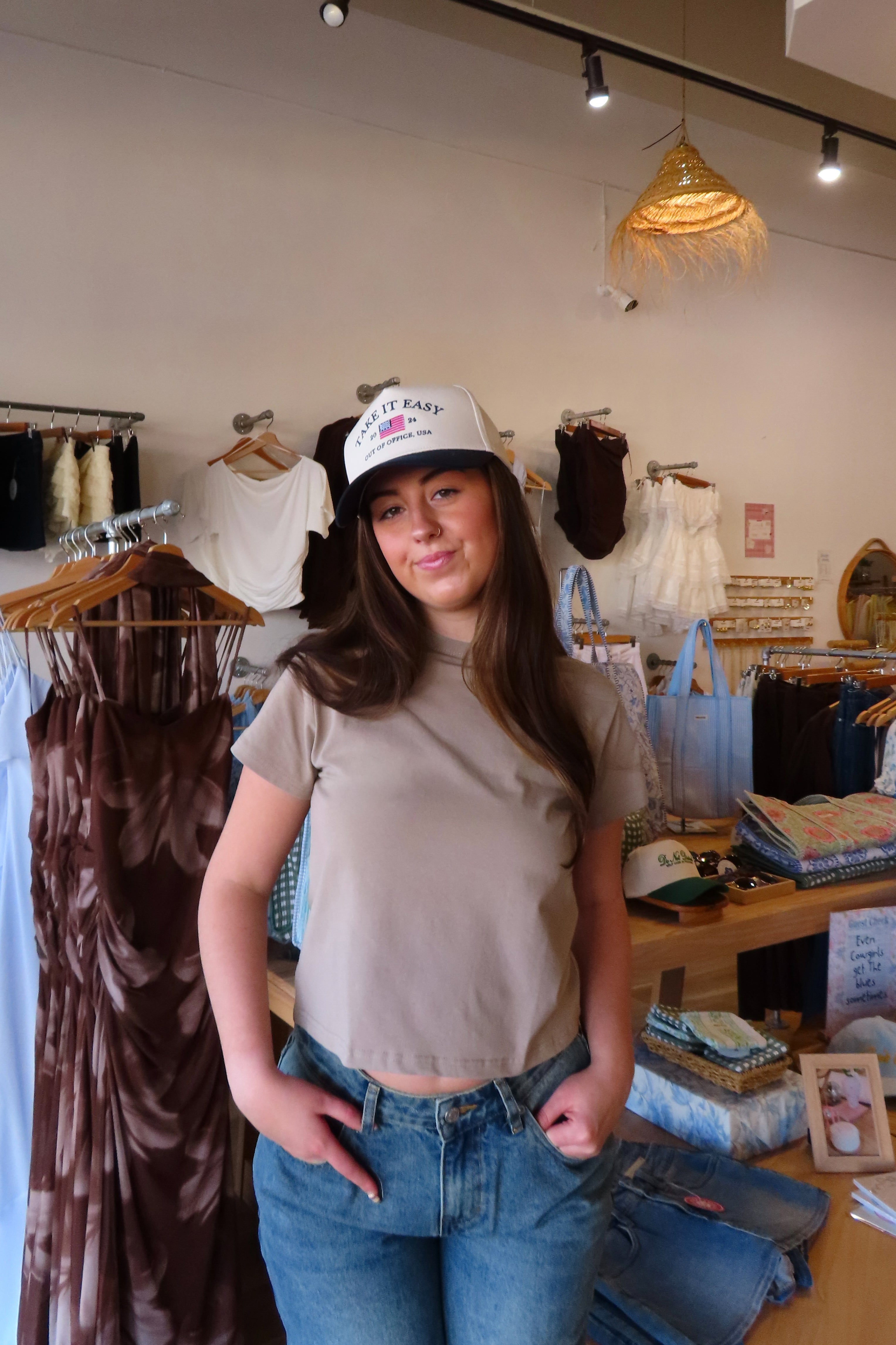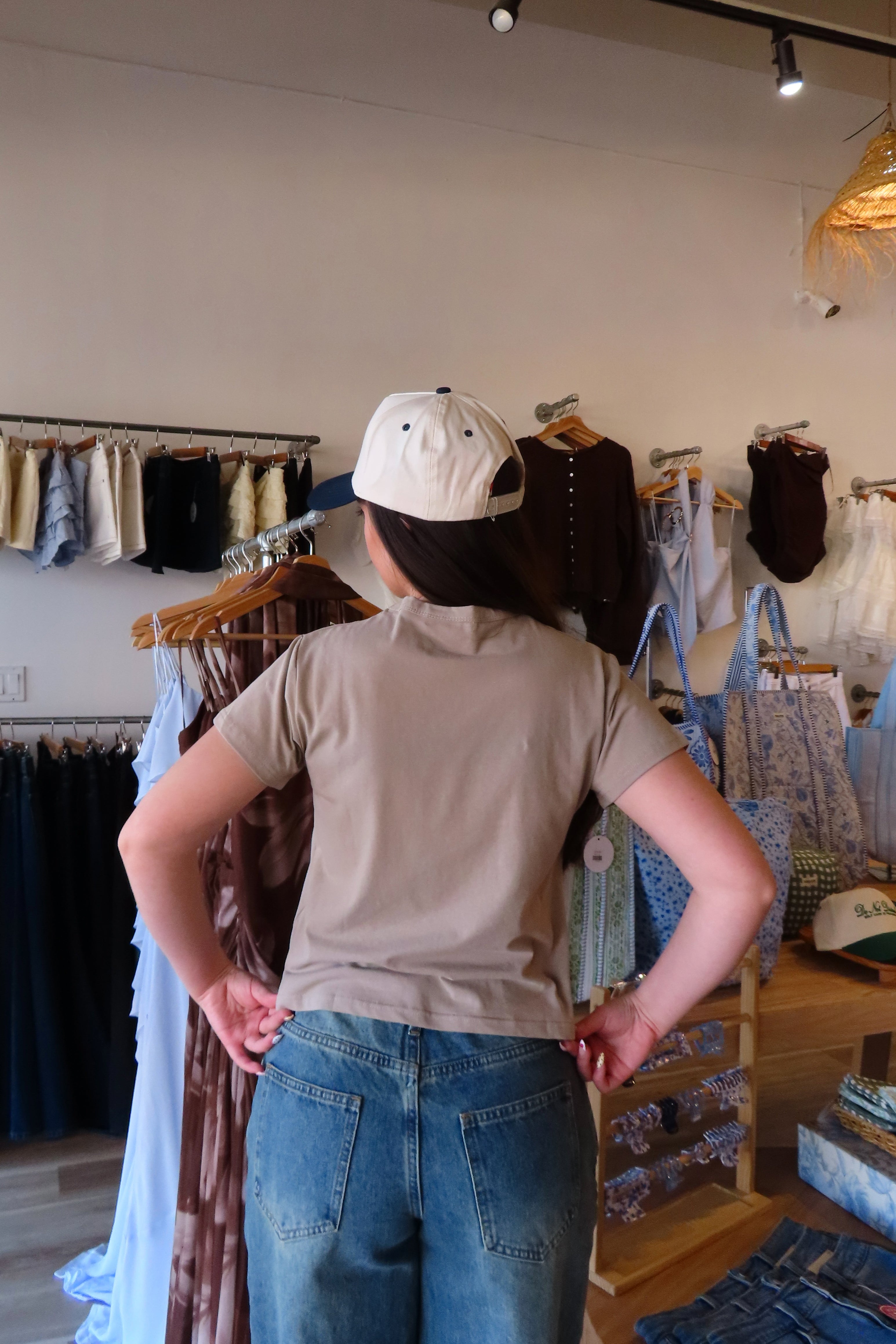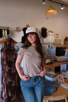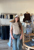 Tan, vintage wash top with crew neckline, short sleeves, and loose fit
