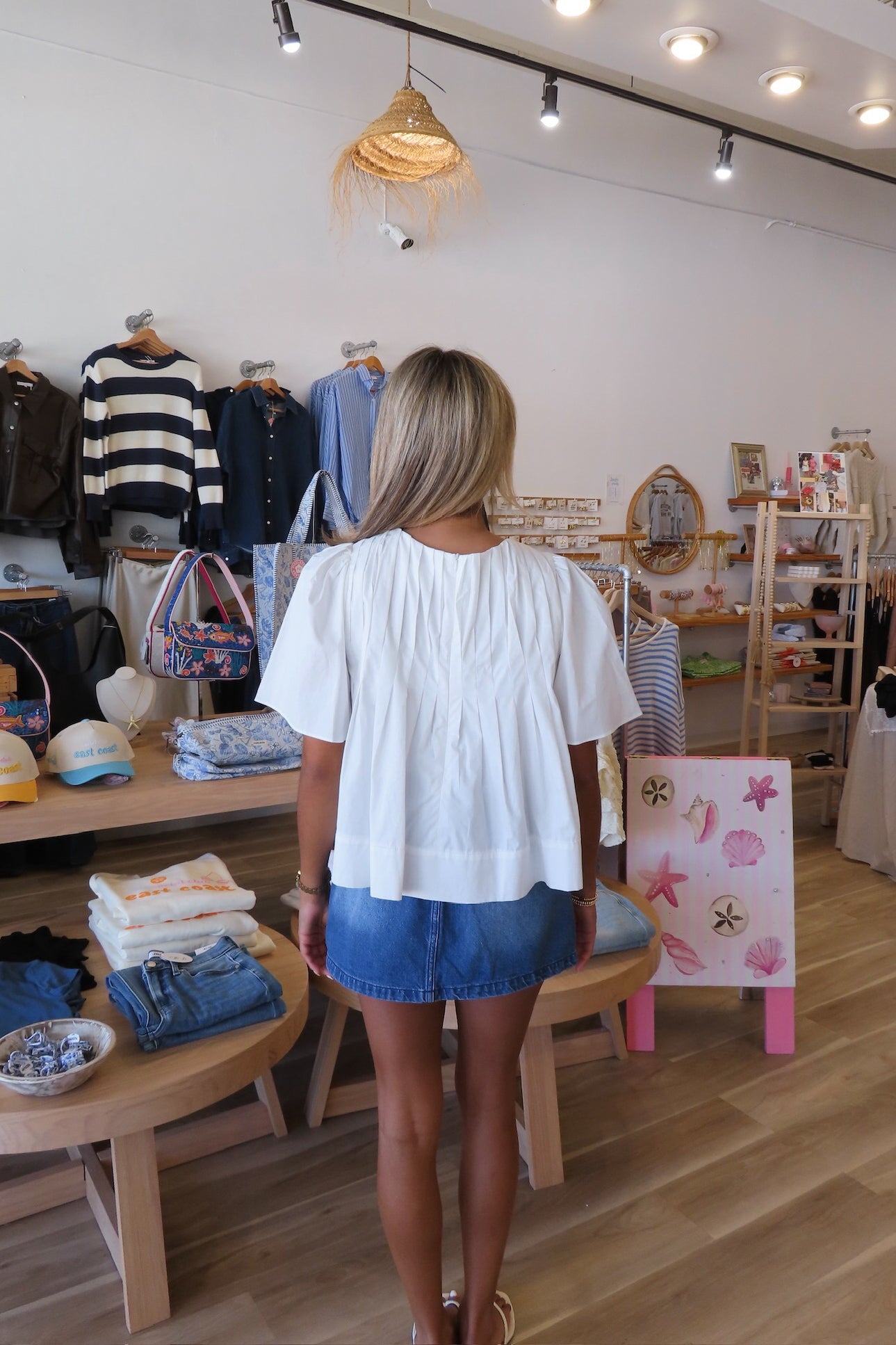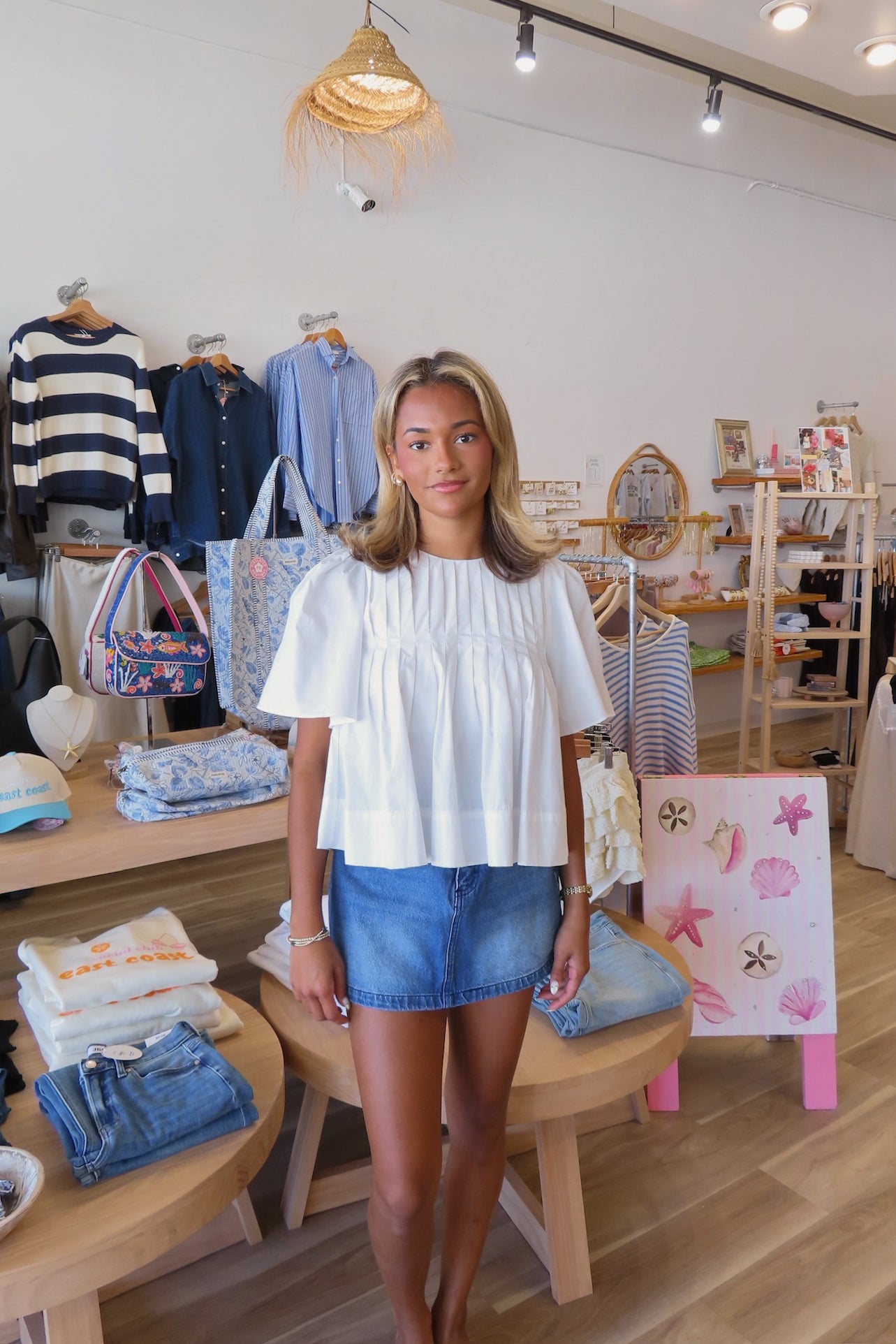 White, pleated babydoll top with round neckline, flared sleeves, back zipper, and lining