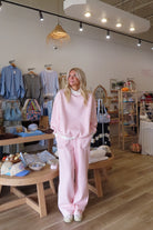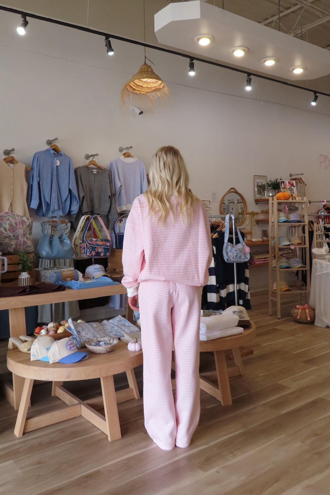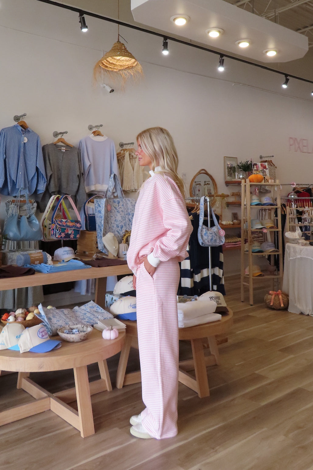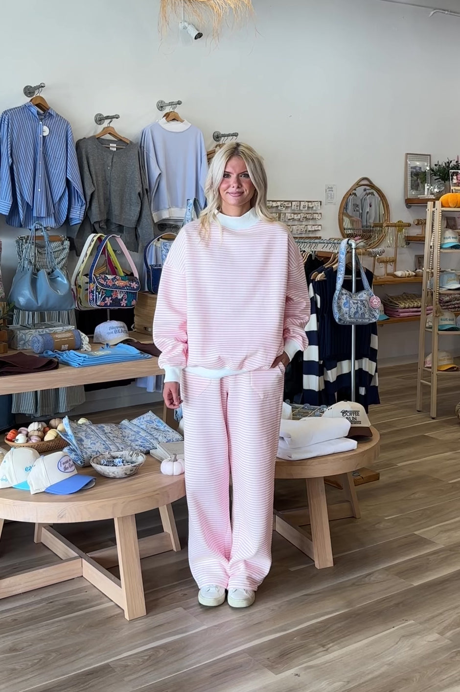 Pink, striped sweatpants with elastic waist, contrast band, and side pockets.
