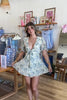 Green, floral mini dress with V-neckline, puff sleeves, front tie, and back zipper