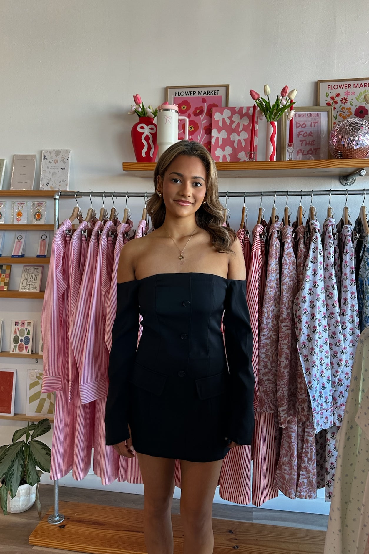 Black, off shoulder mini dress with long sleeves, front buttons, and back zipper