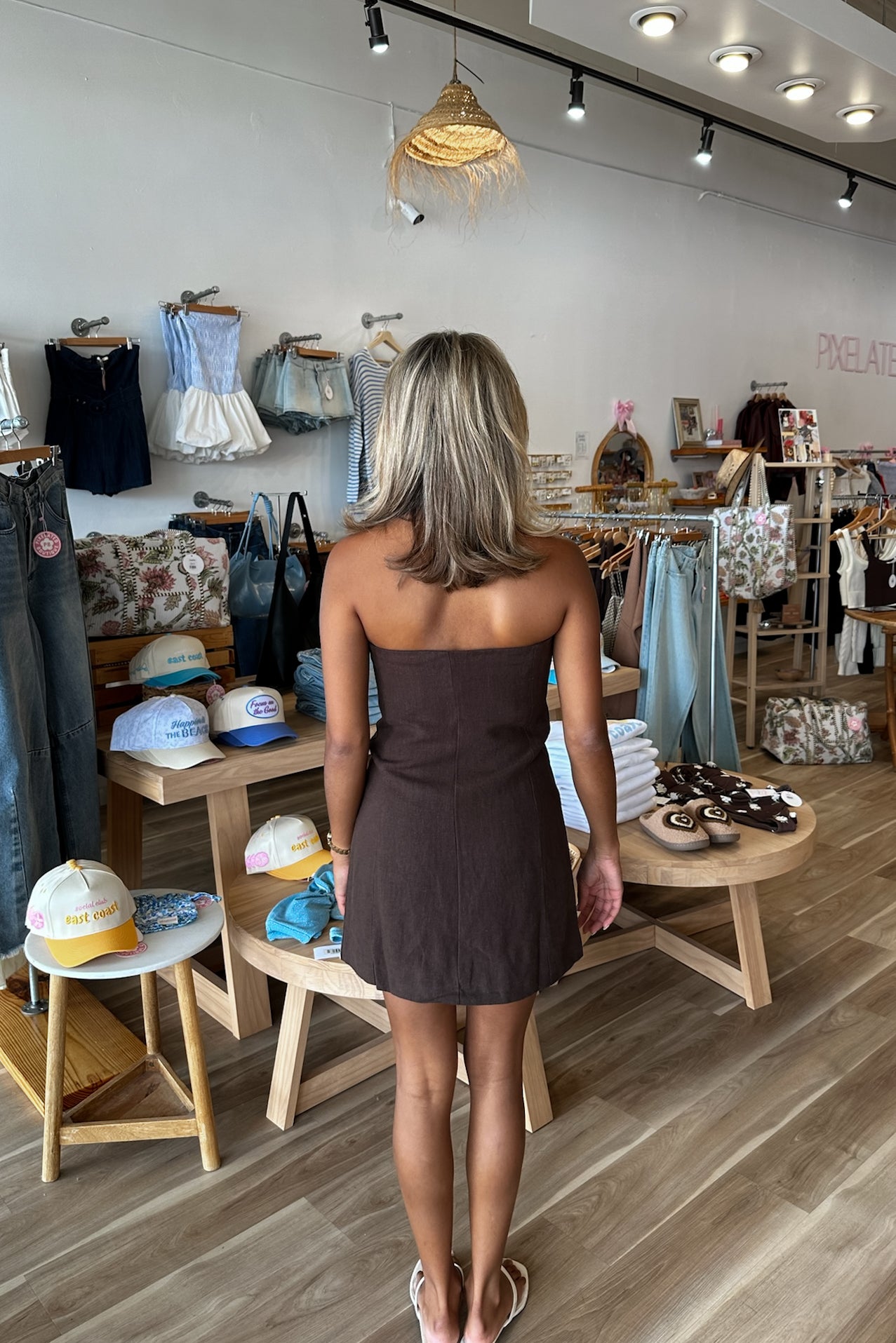 Brown, strapless mini dress with buttons and pocket flaps