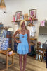 Blue, strapless mini dress with twisted bust, center cutout, ruffled tiers, and double elasticated back straps