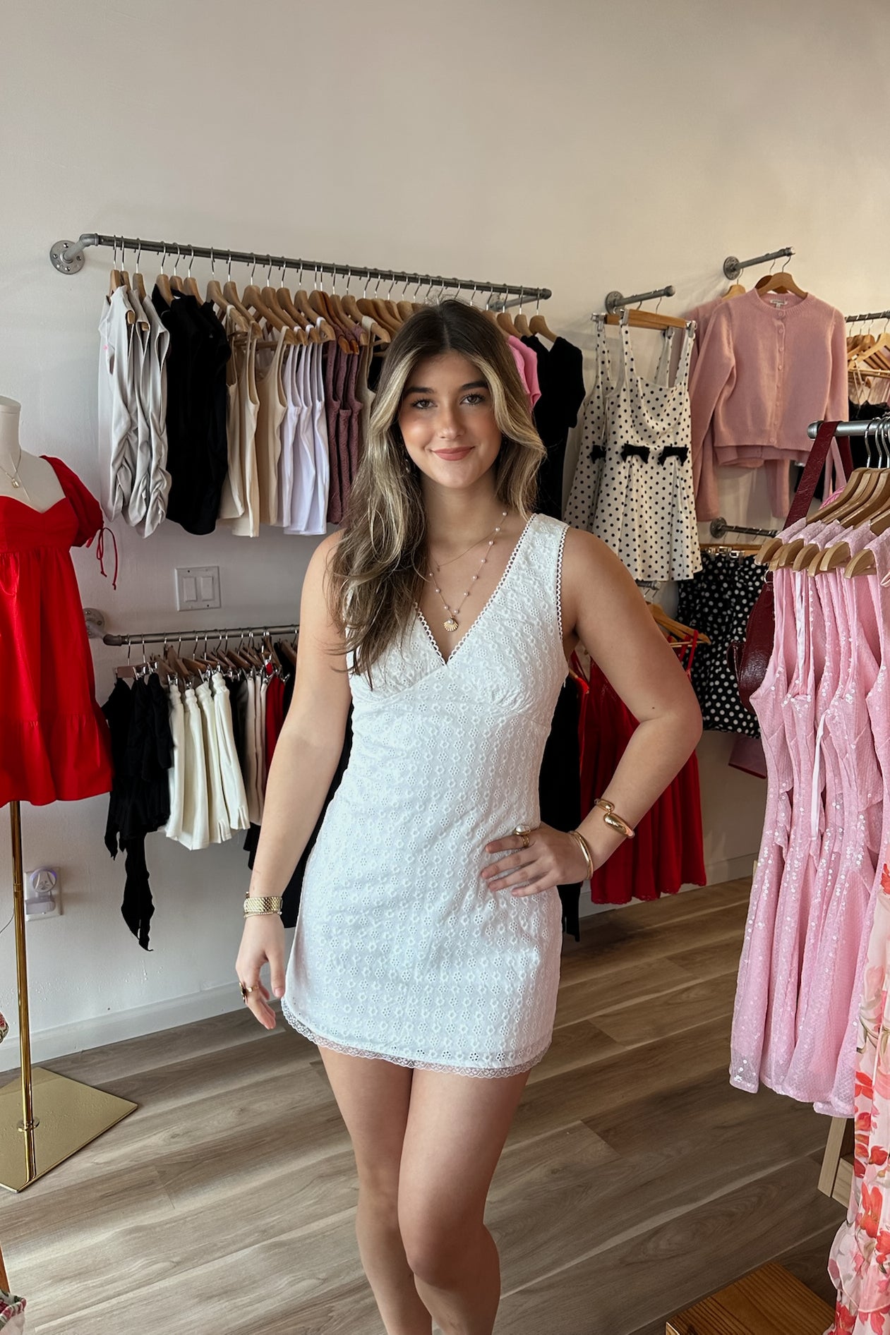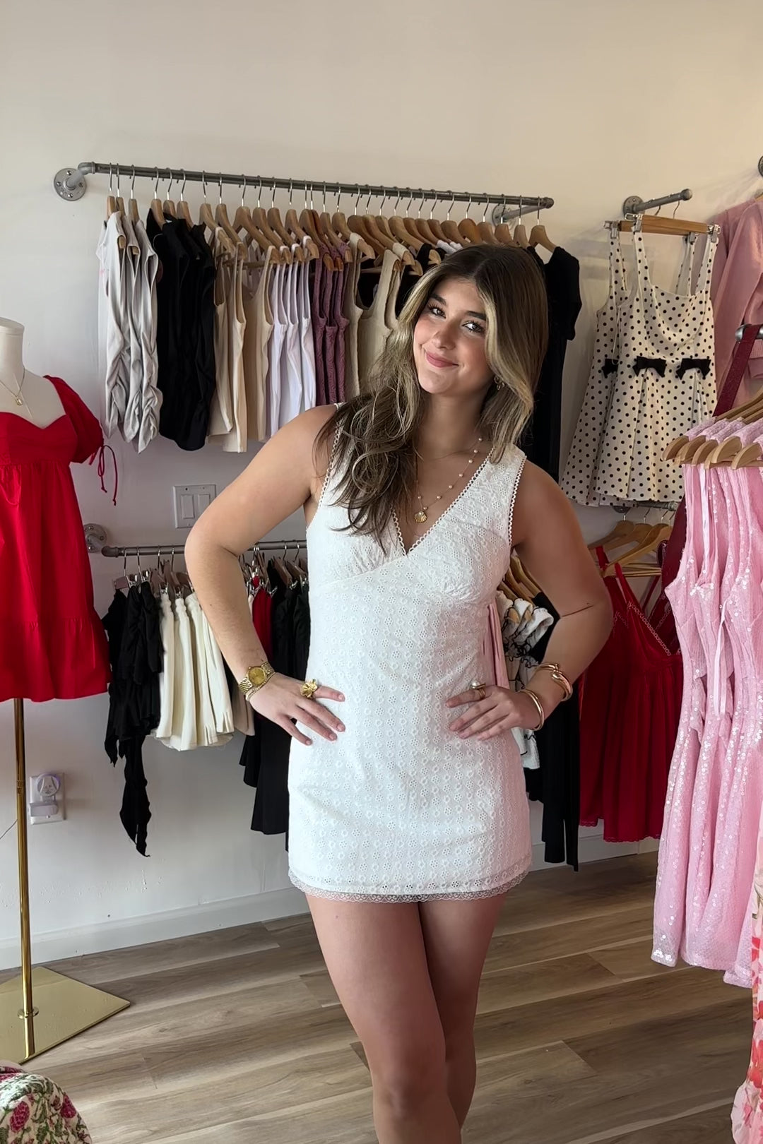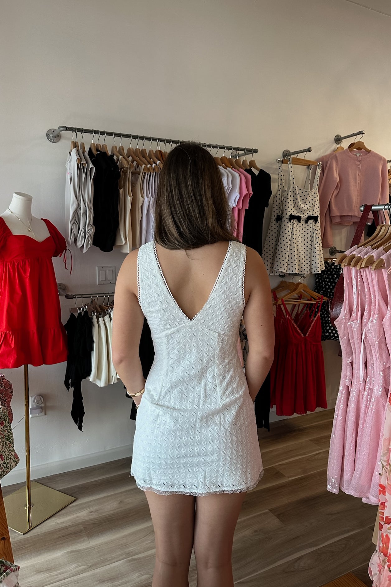 White, eyelet mini dress with V-neckline, lace trim, and side zipper