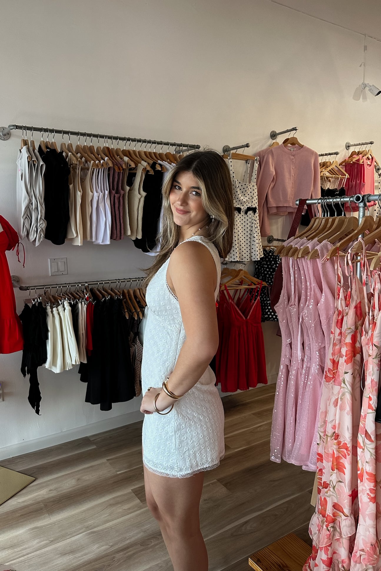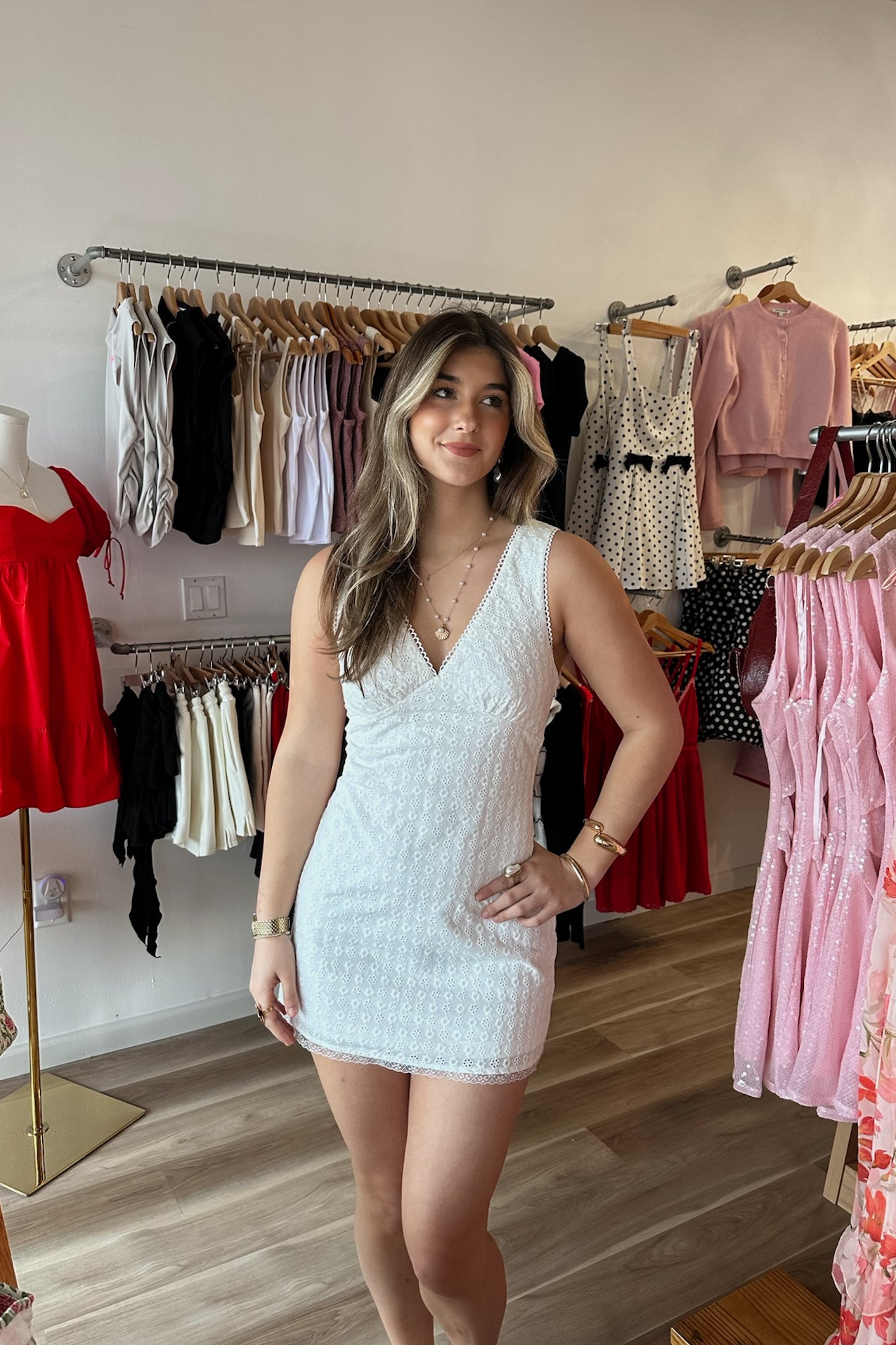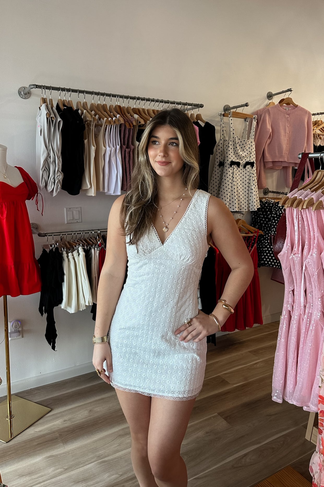White, eyelet mini dress with V-neckline, lace trim, and side zipper