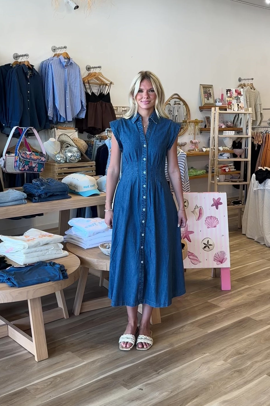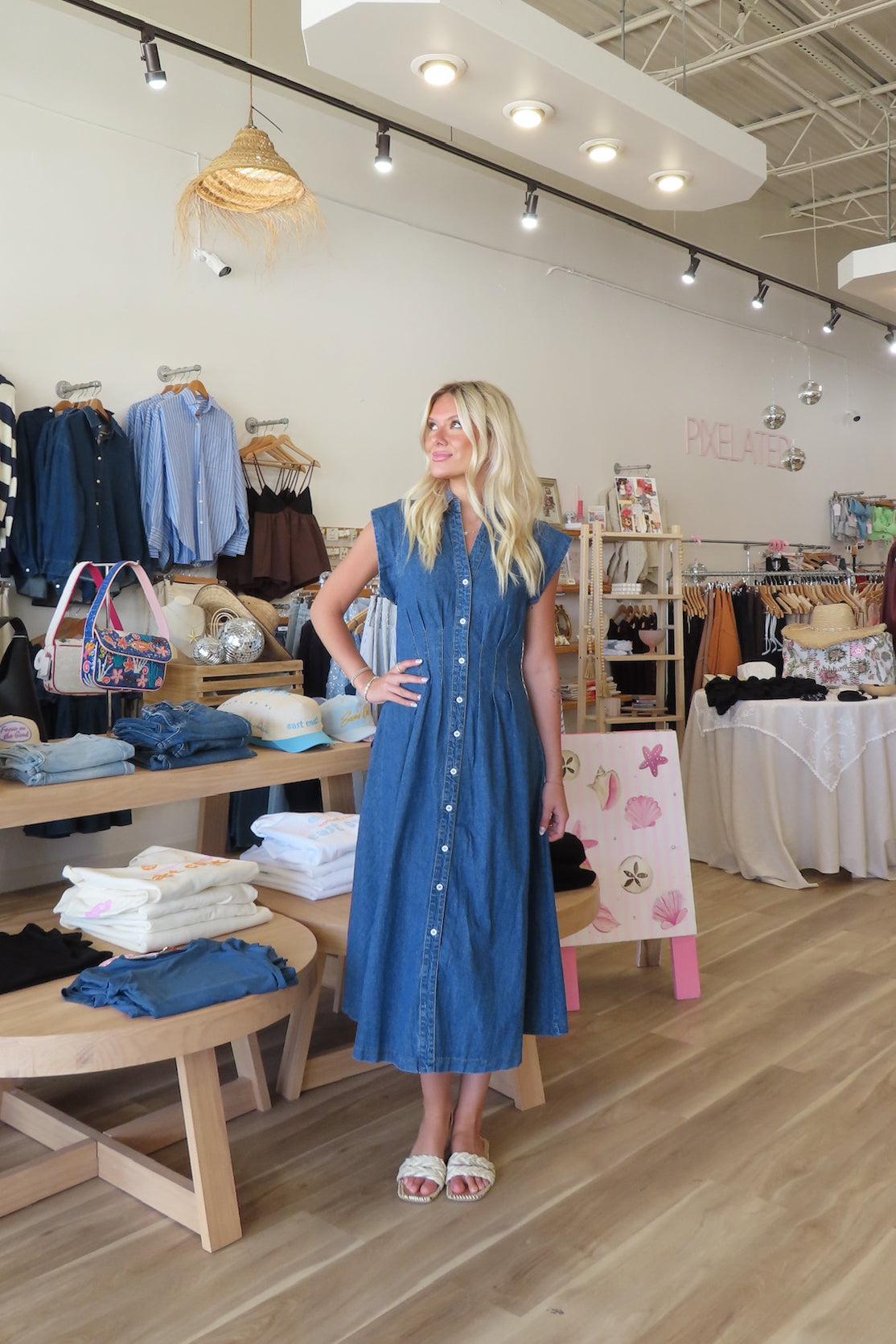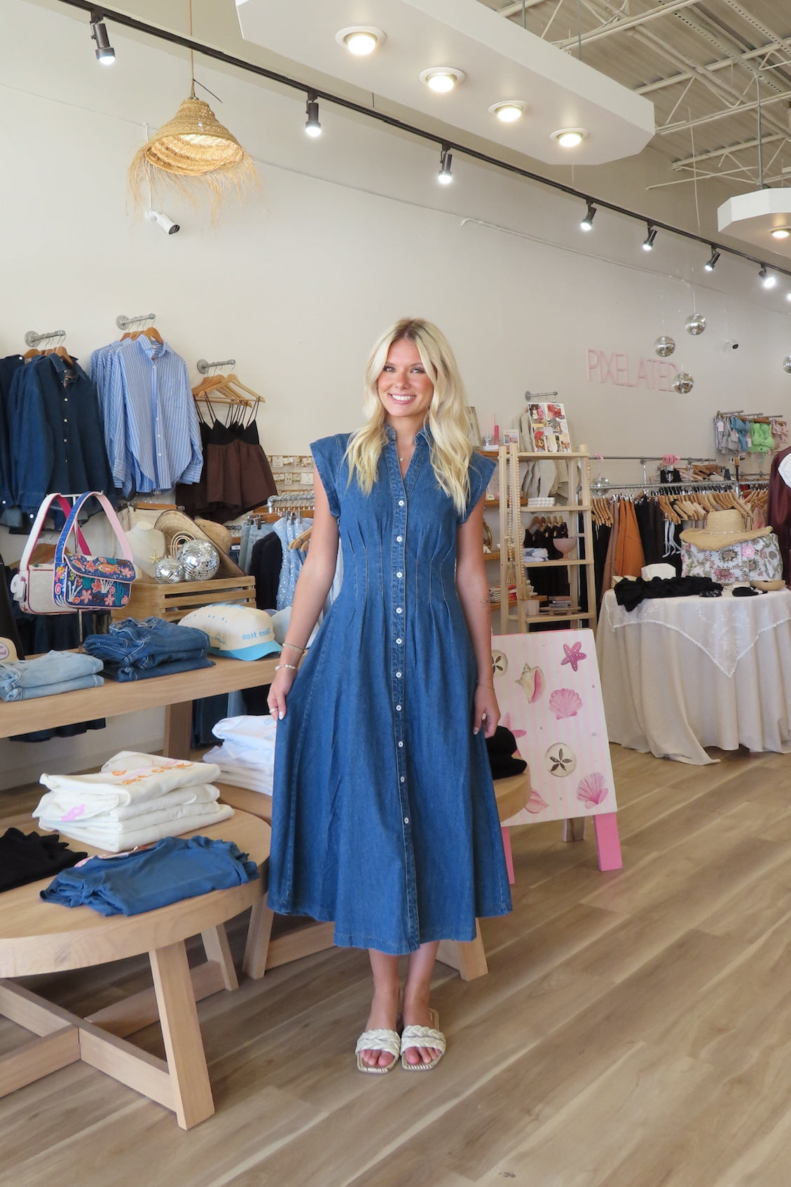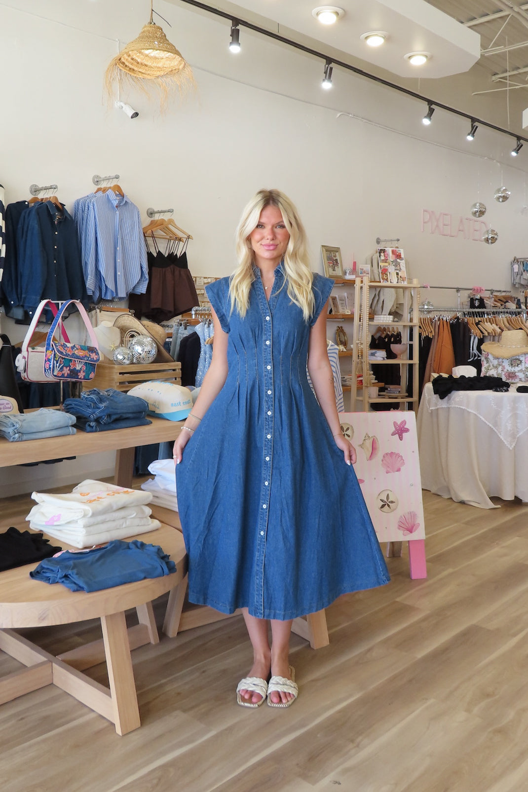 Blue, denim midi dress with V-neckline, pleated waist, collar, and button down