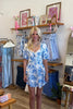 Blue, floral mini dress with puff sleeves, lace up front, ruffled tiers, and back clasp