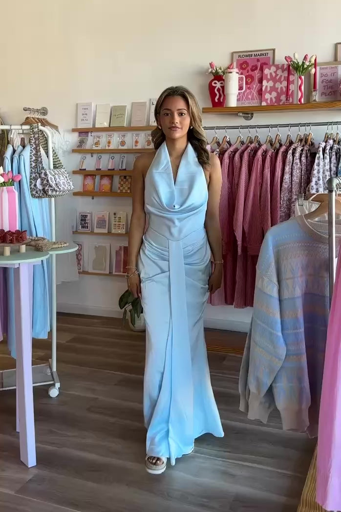 Blue, maxi dress with cowl halter neckline, front ruching, and open back with zipper