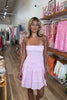 Pink, eyelet strapless dress with front ribbon smocked bodice, ruffled tiers, and lace trim