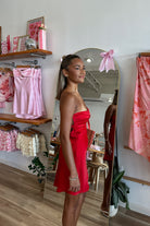 Red, strapless satin mini dress with twisted bust, center cutout, cowl back, and double elasticated back straps
