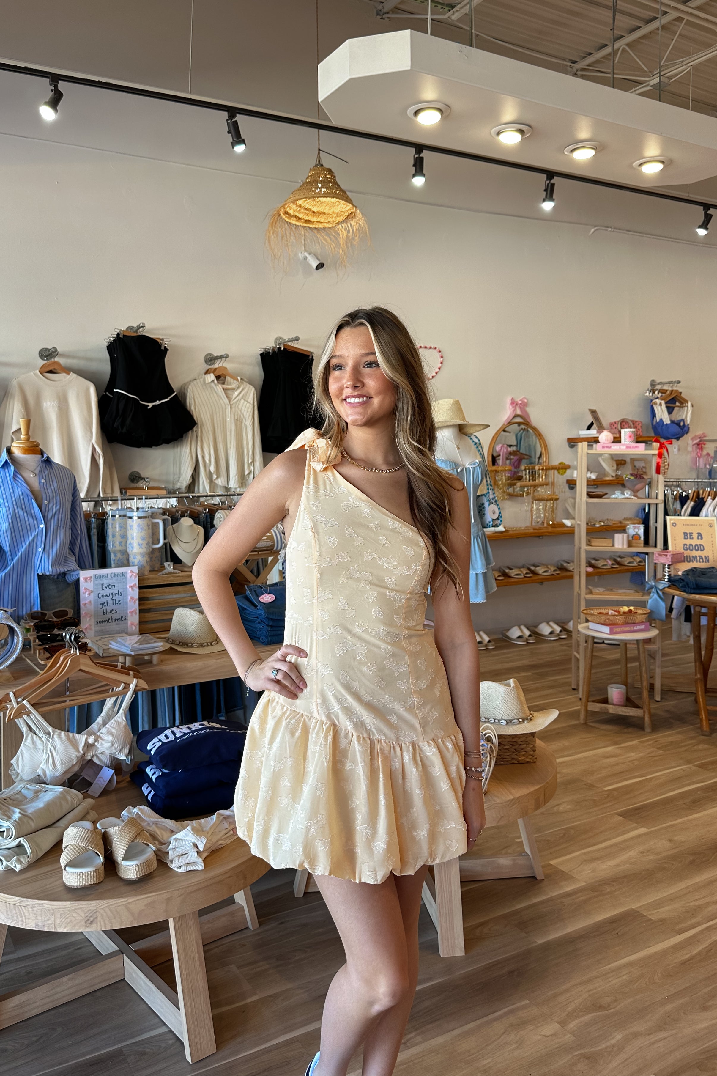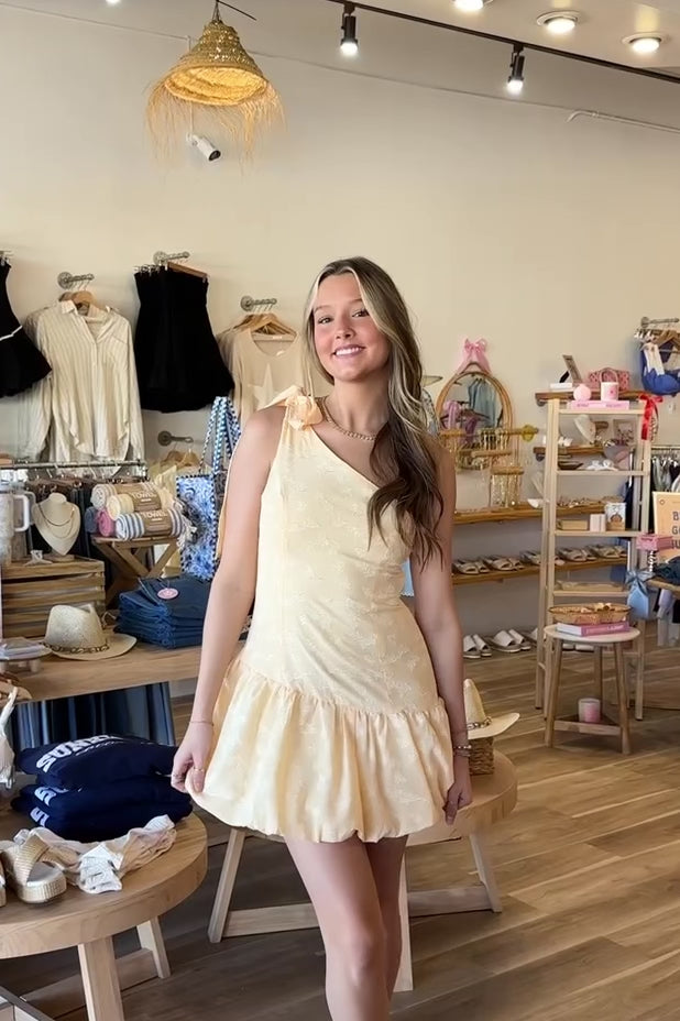 Yellow, jacquard mini dress with one shoulder strap and bubble skirt