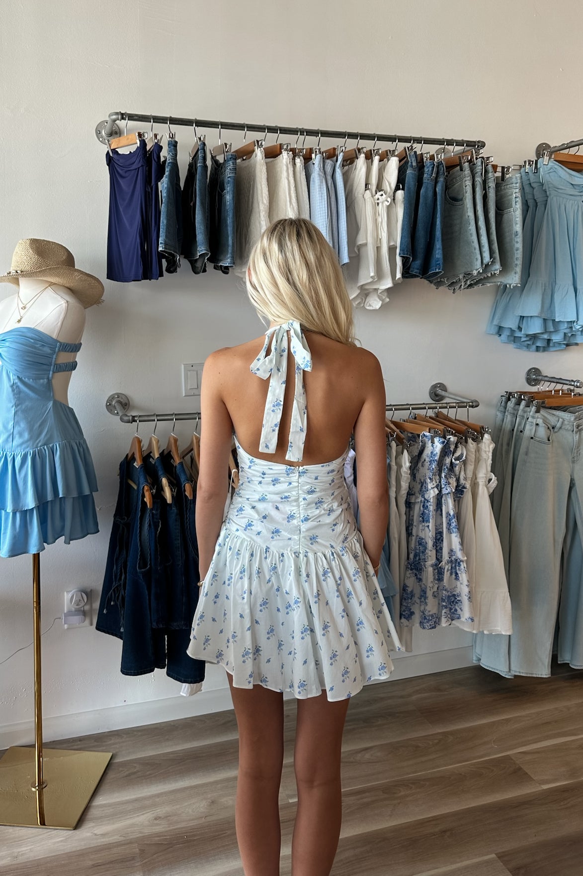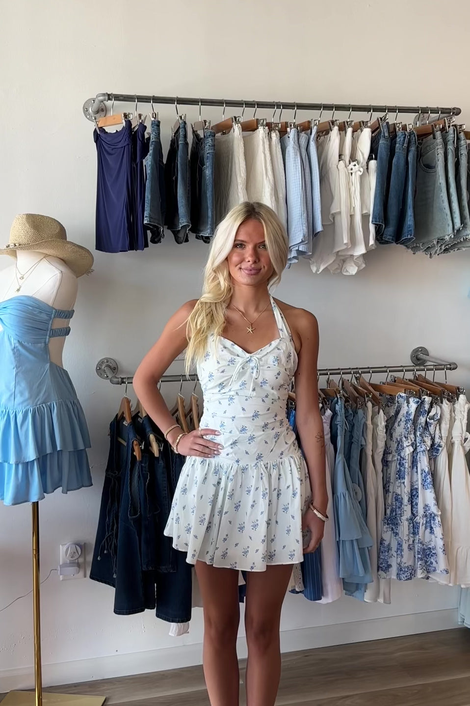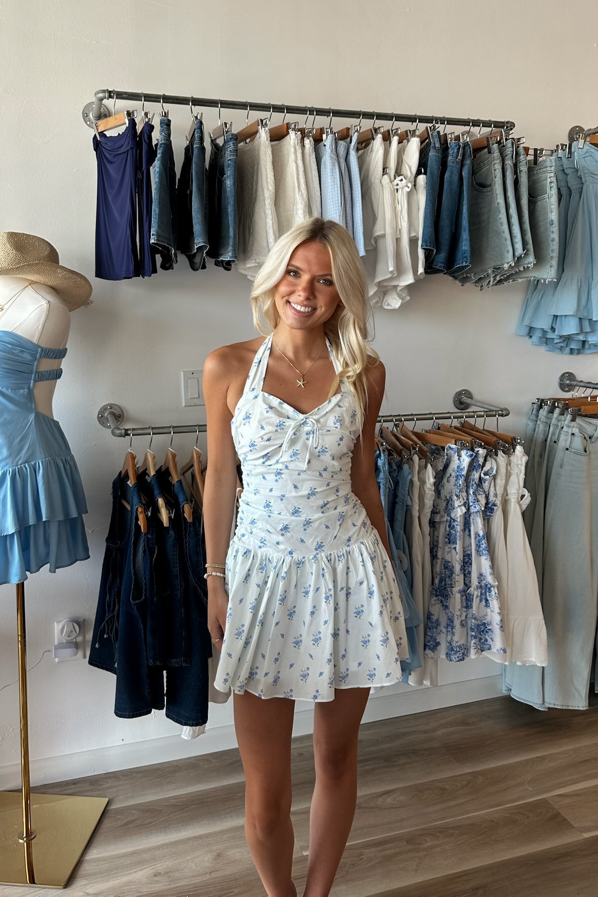 Blue, floral halter neck mini dress with sweetheart neckline, front tie, and drop waist