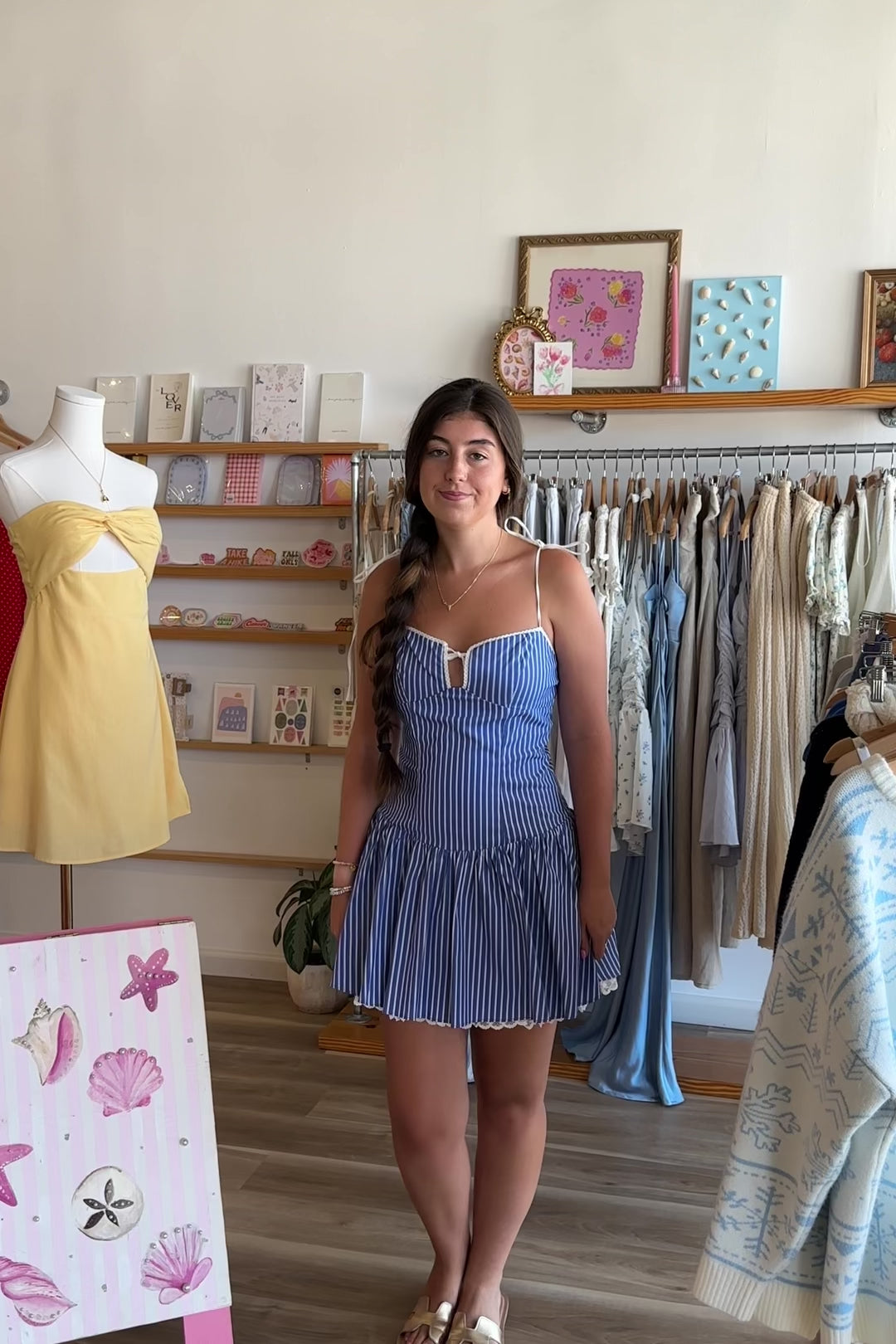 Blue, pinstripe mini dress with front tie, ruffled and lace layered hem, and tie straps