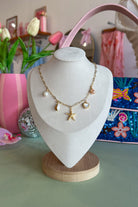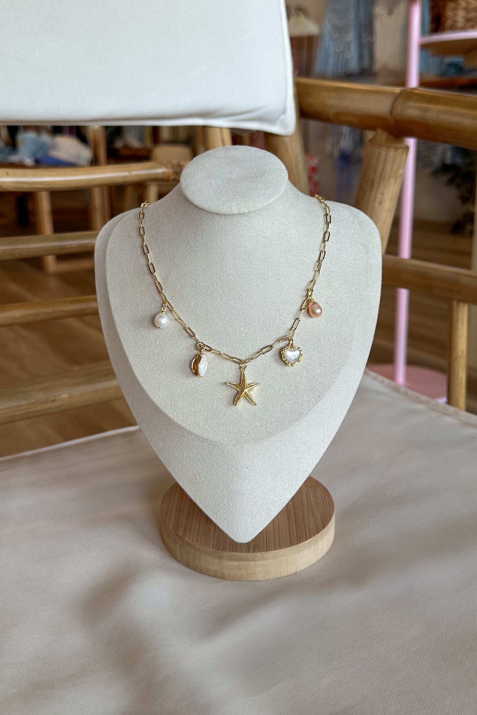 Gold filled, pearl and gold charms on paperclip chain necklace