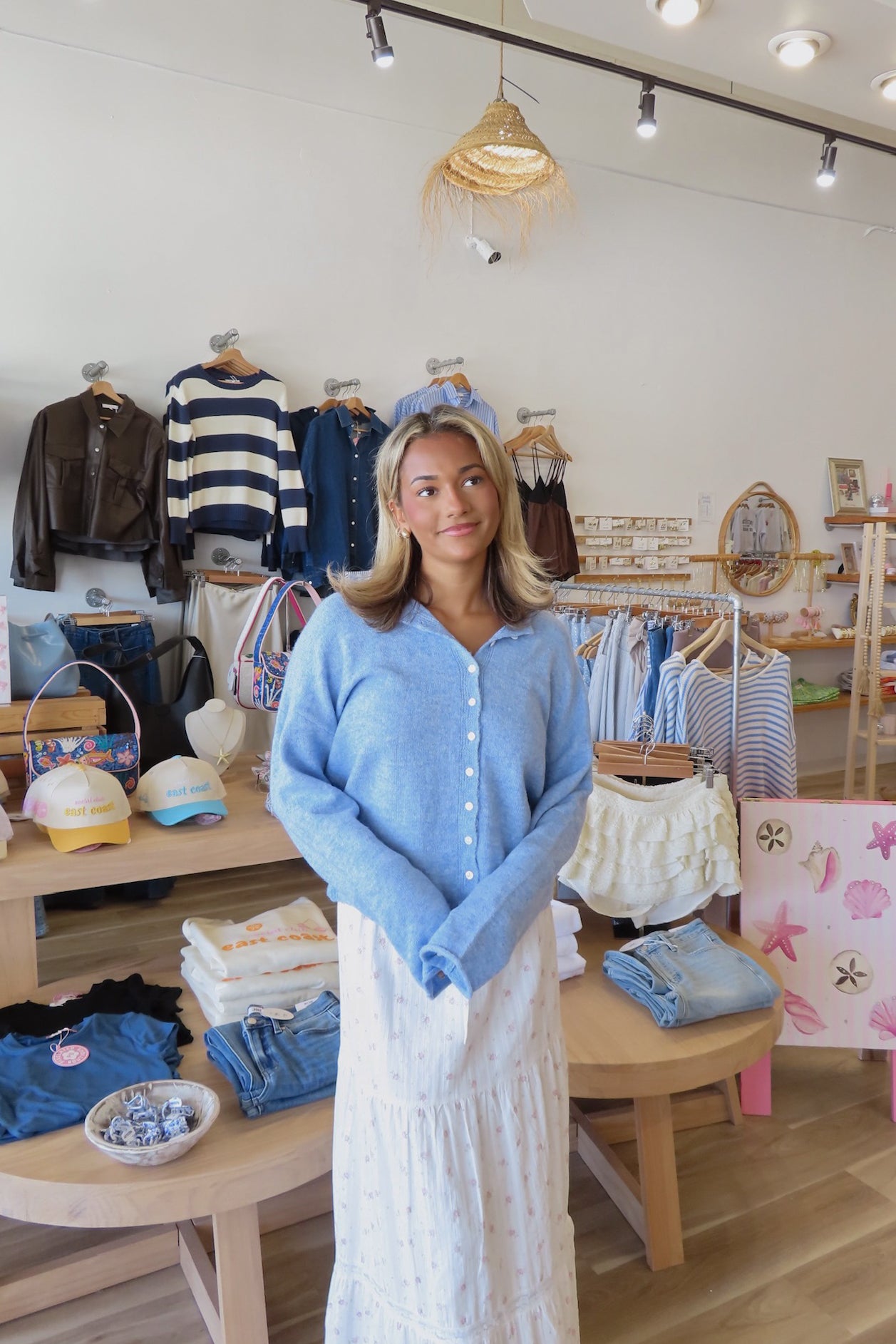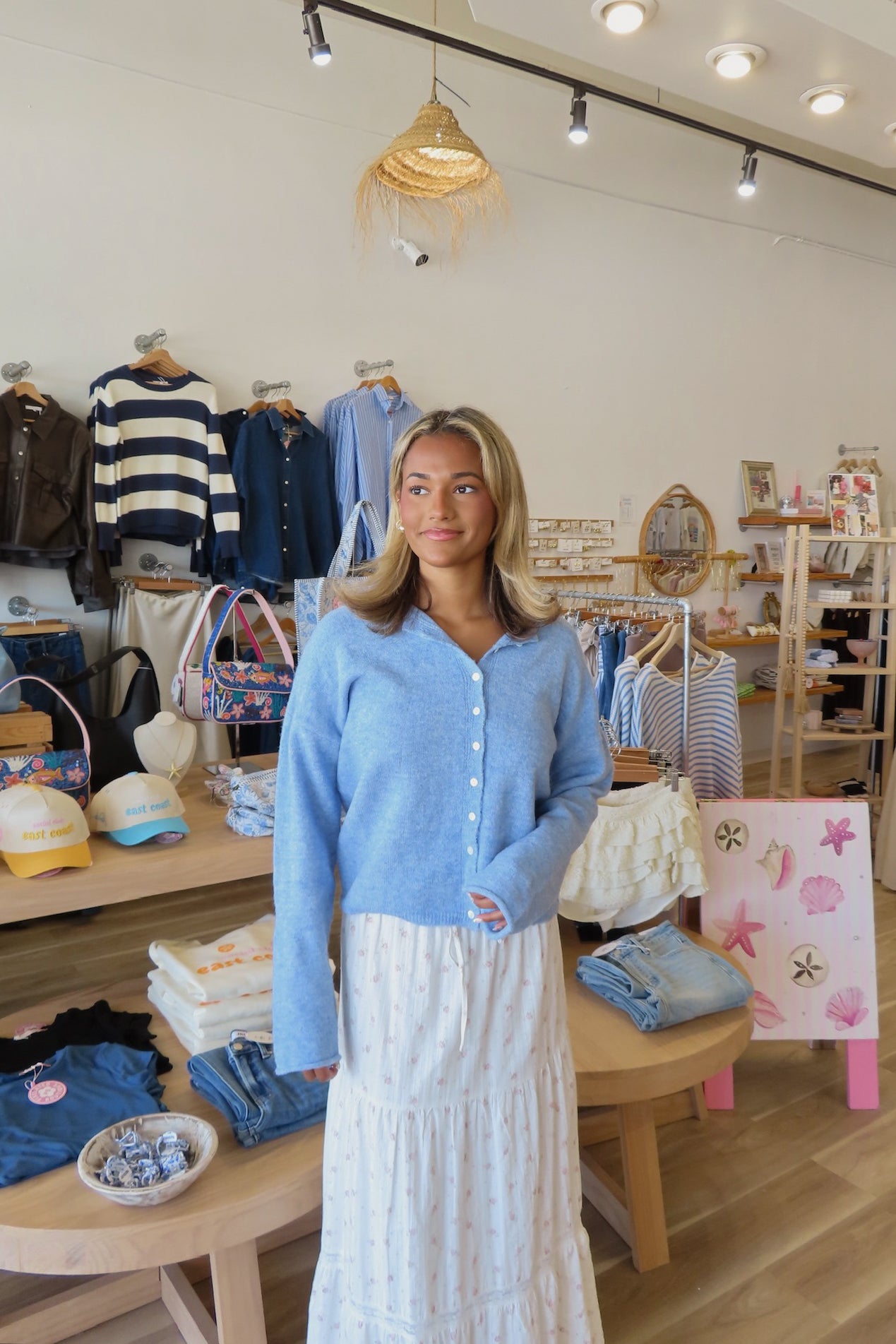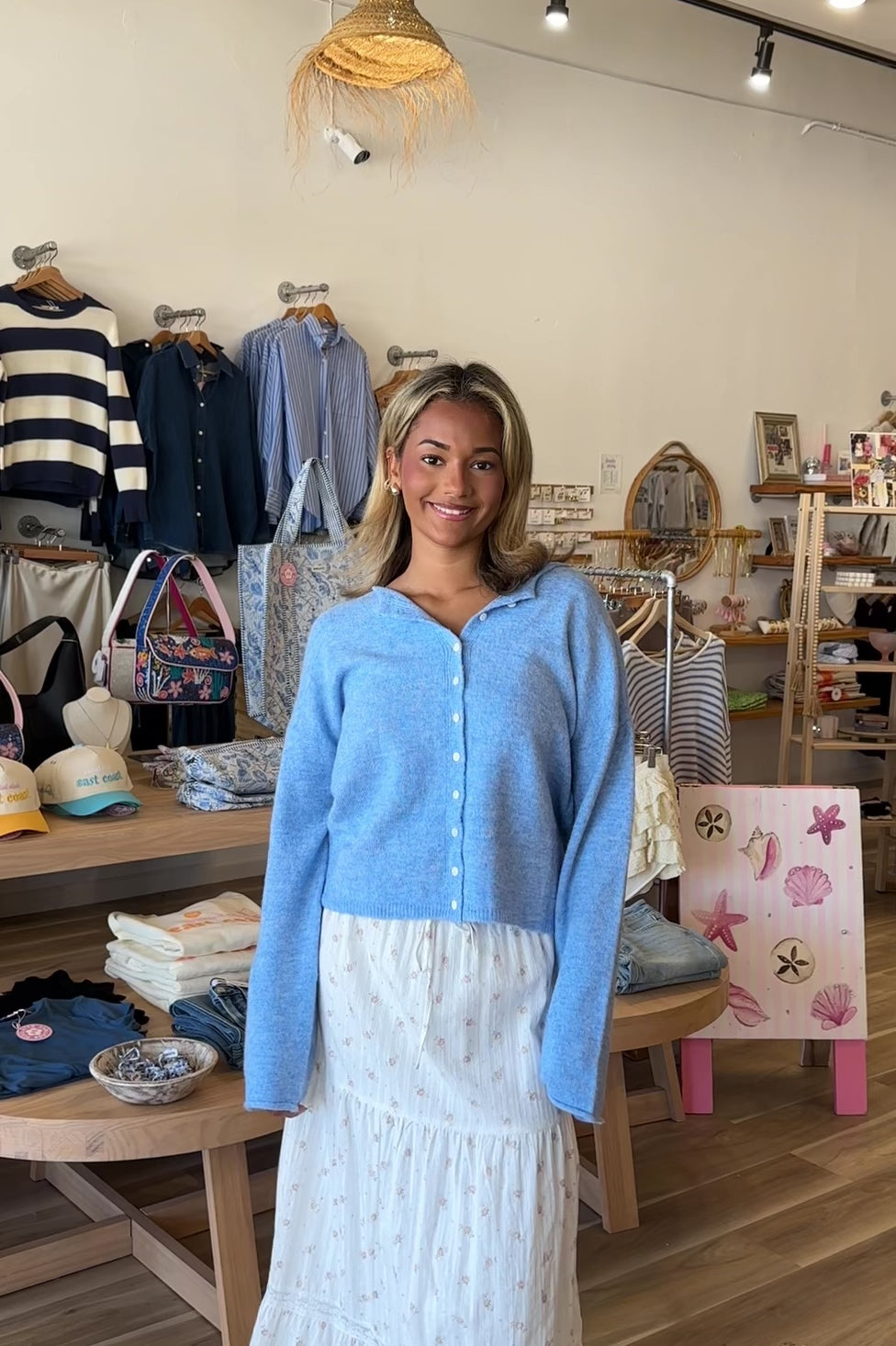 Blue, rolled collar cardigan with button down, drop shoulder, and ribbed hem