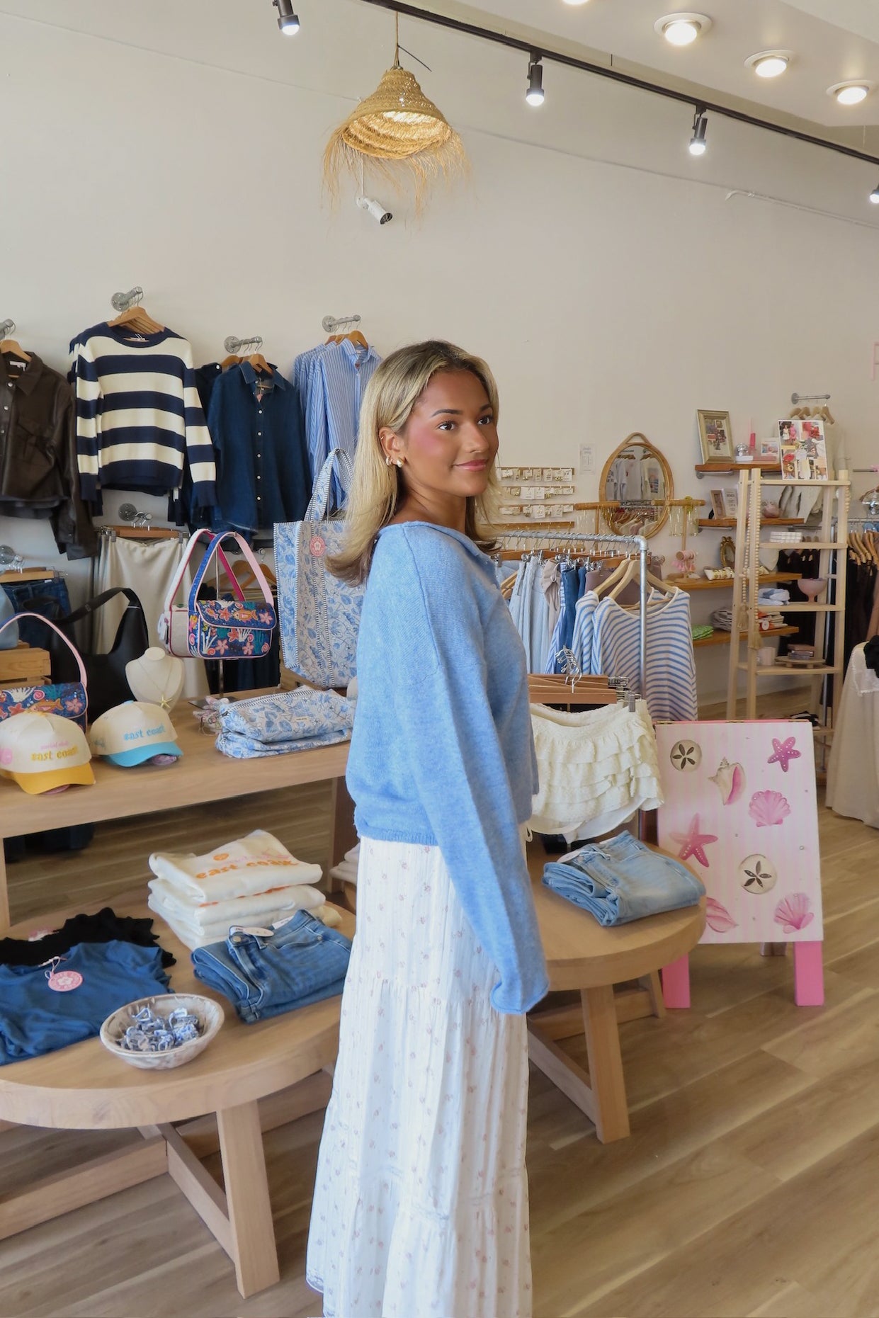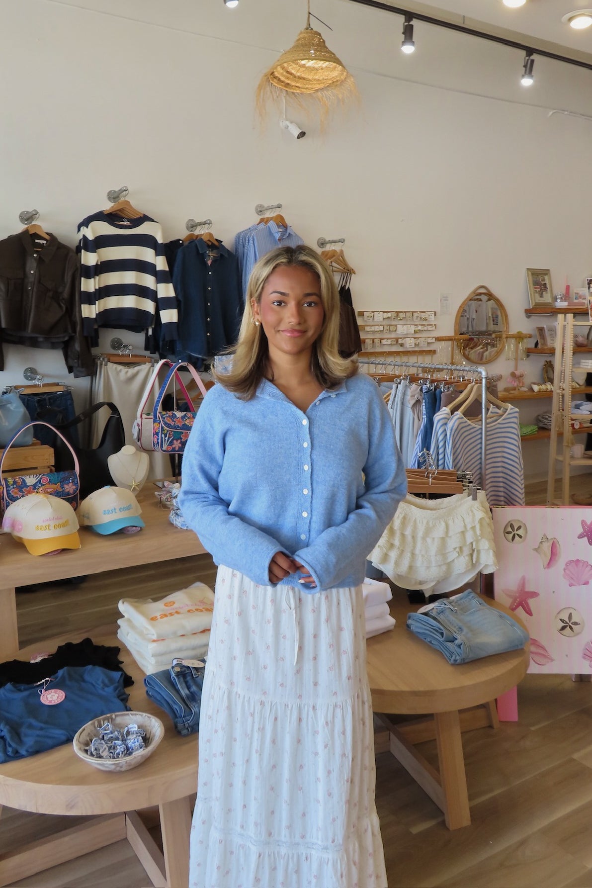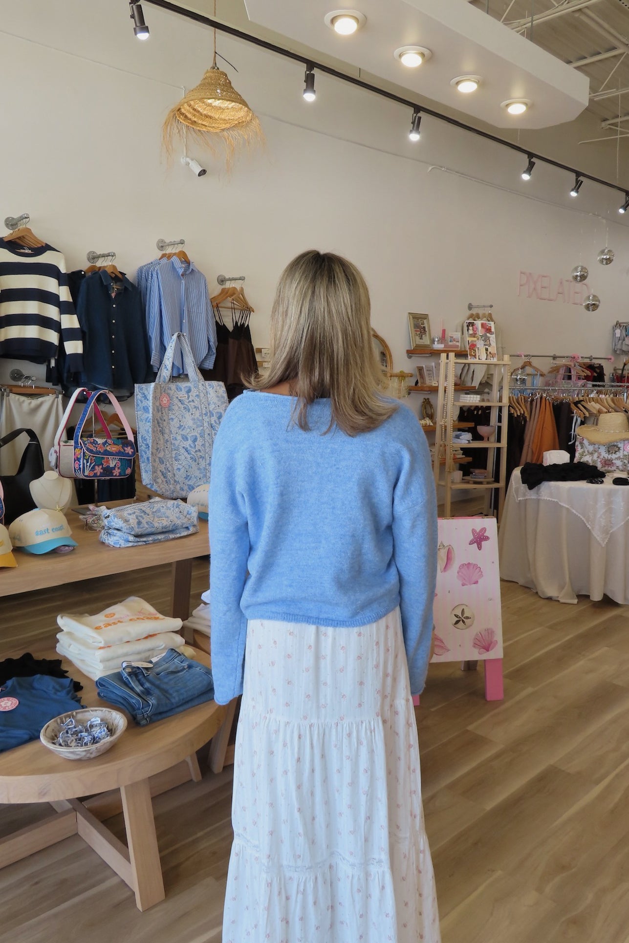 Blue, rolled collar cardigan with button down, drop shoulder, and ribbed hem
