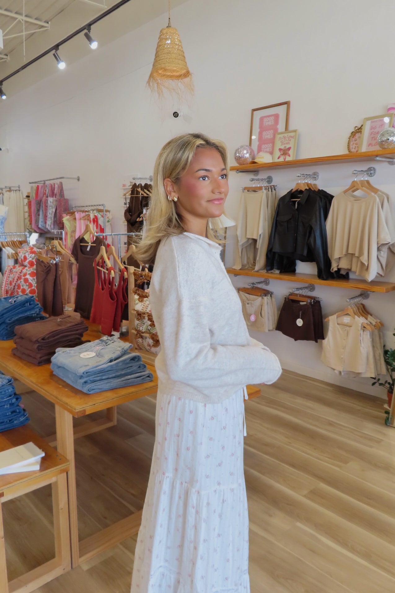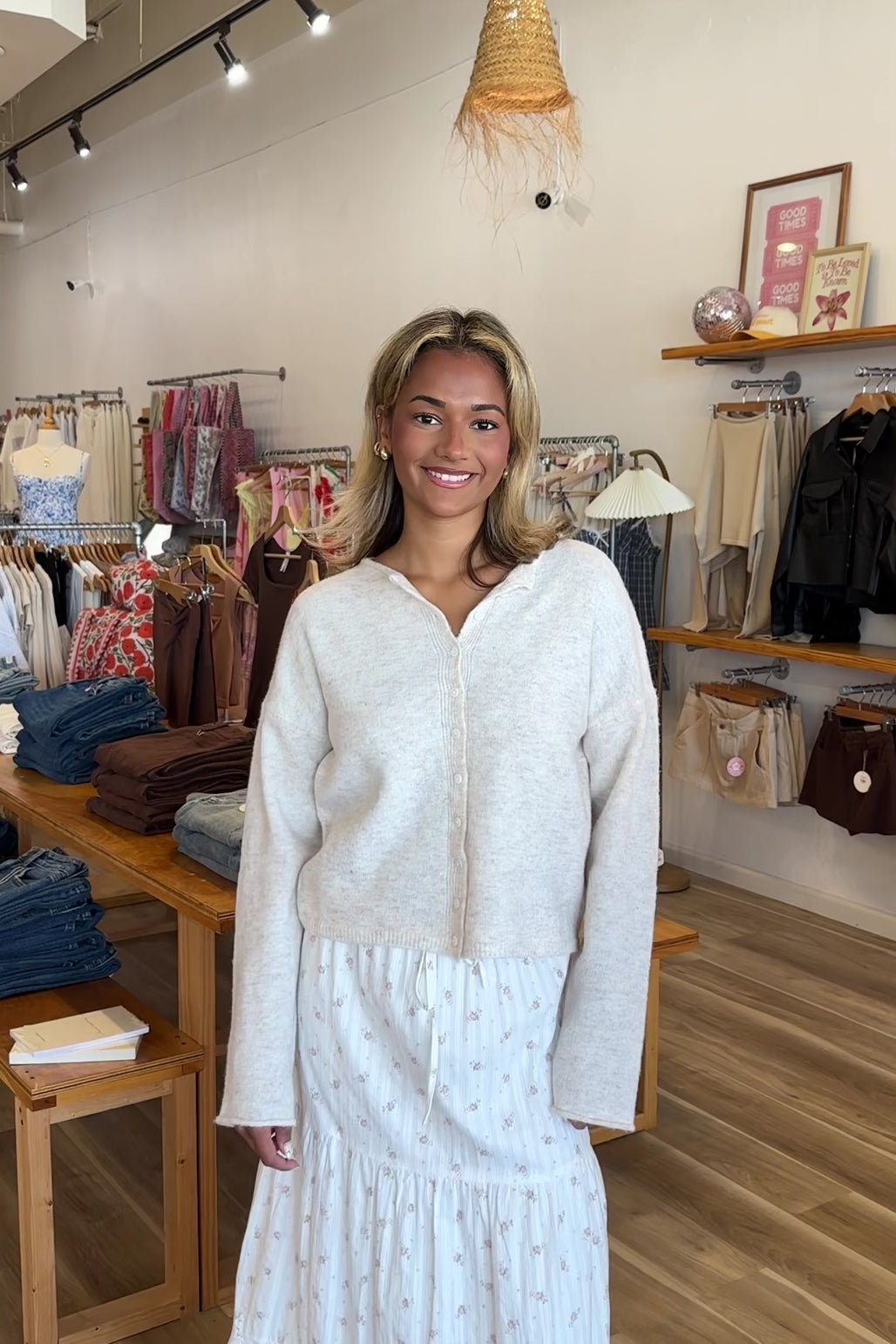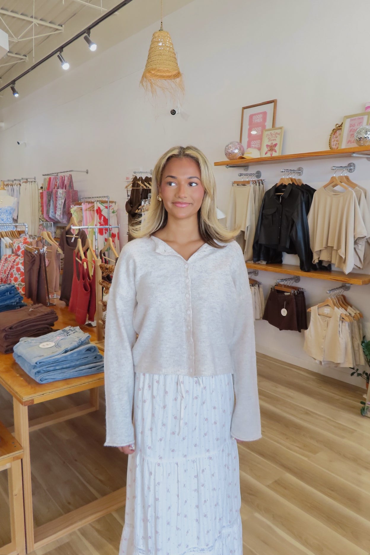 Tan, rolled collar cardigan with button down, drop shoulder, and ribbed hem