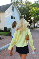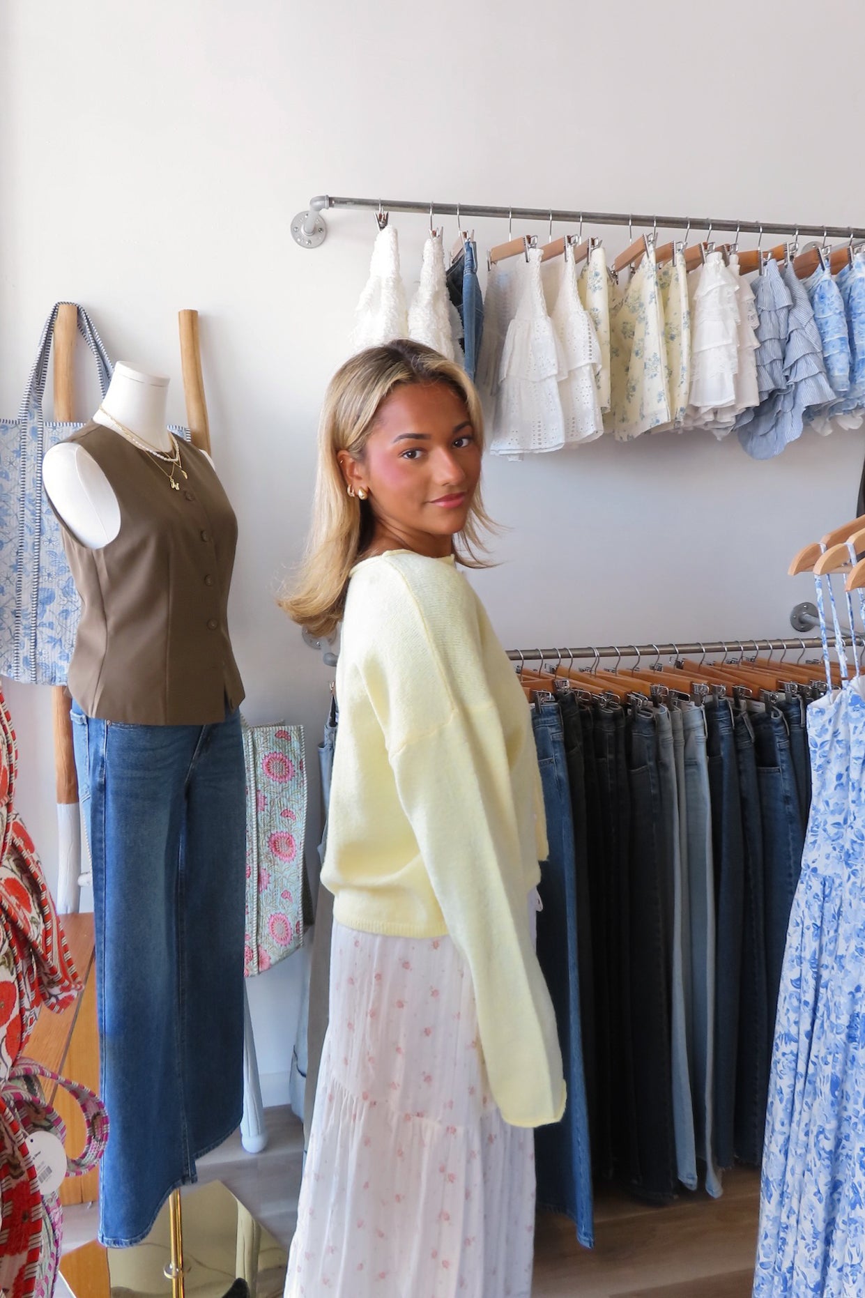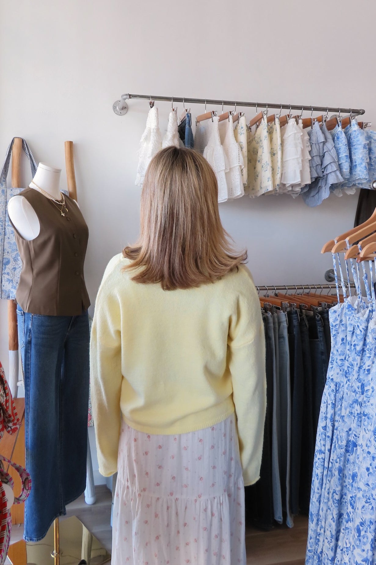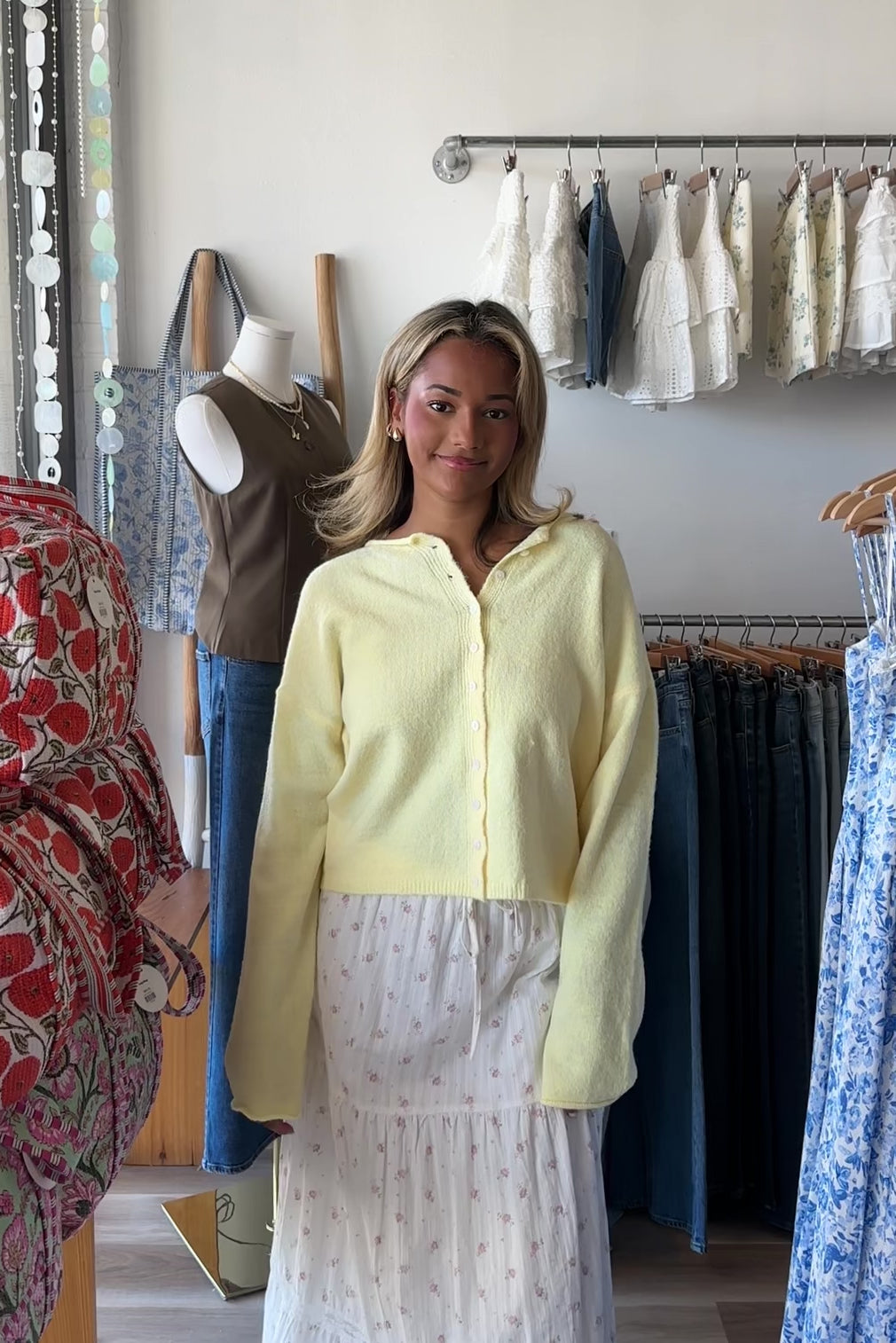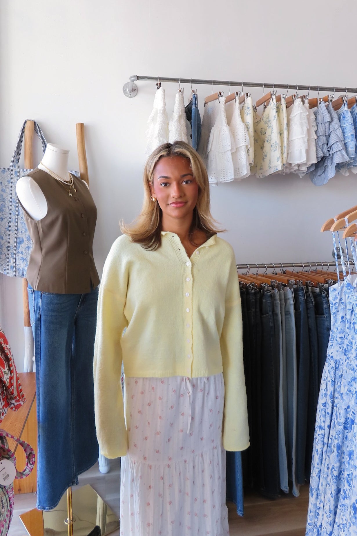Yellow, rolled collar cardigan with button down, drop shoulder, and ribbed hem