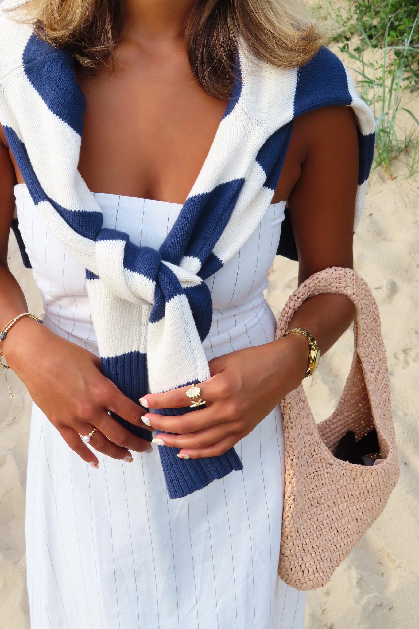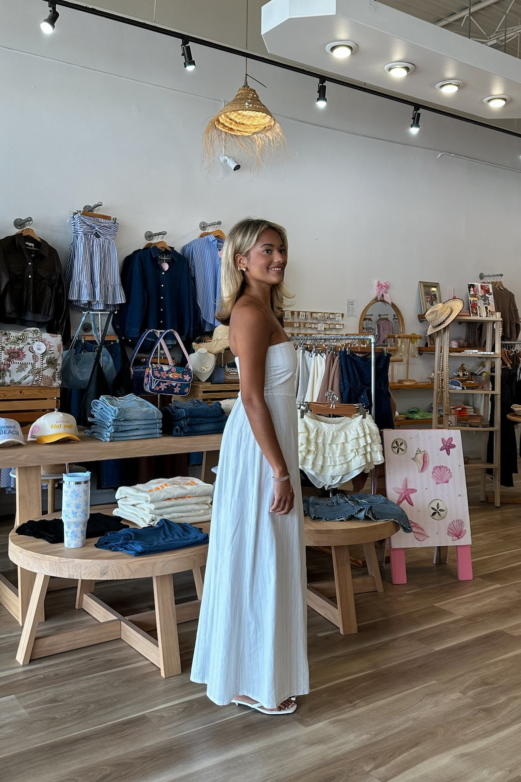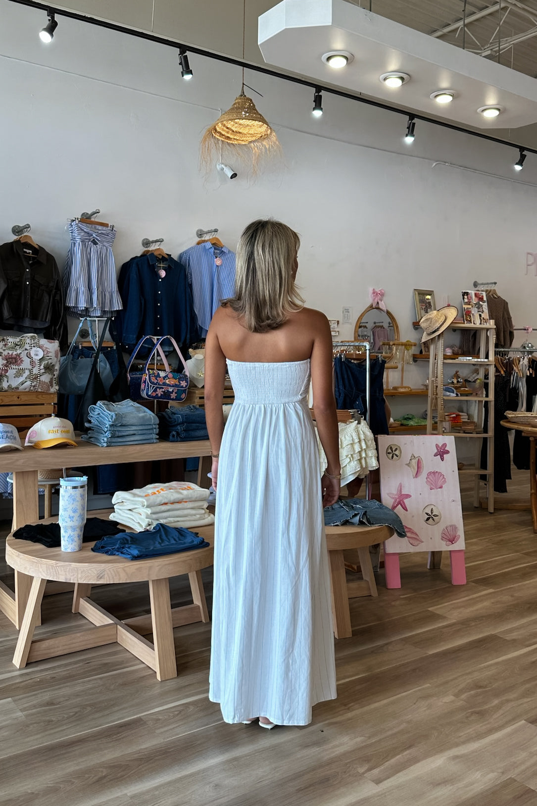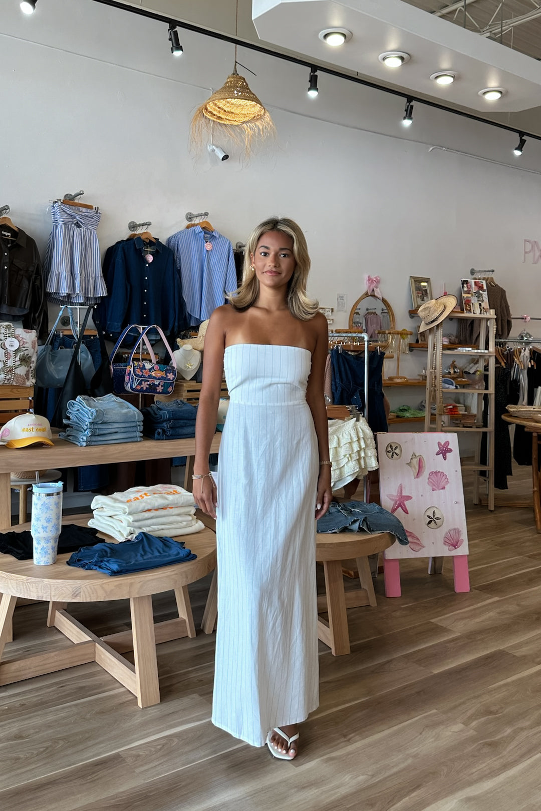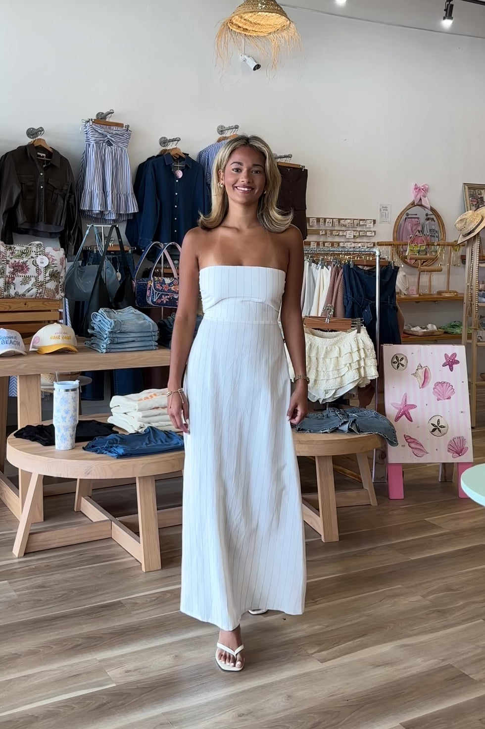 White, striped strapless maxi dress with flared hem and smocked back
