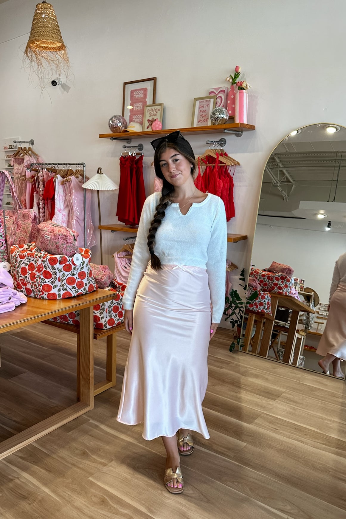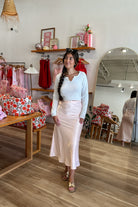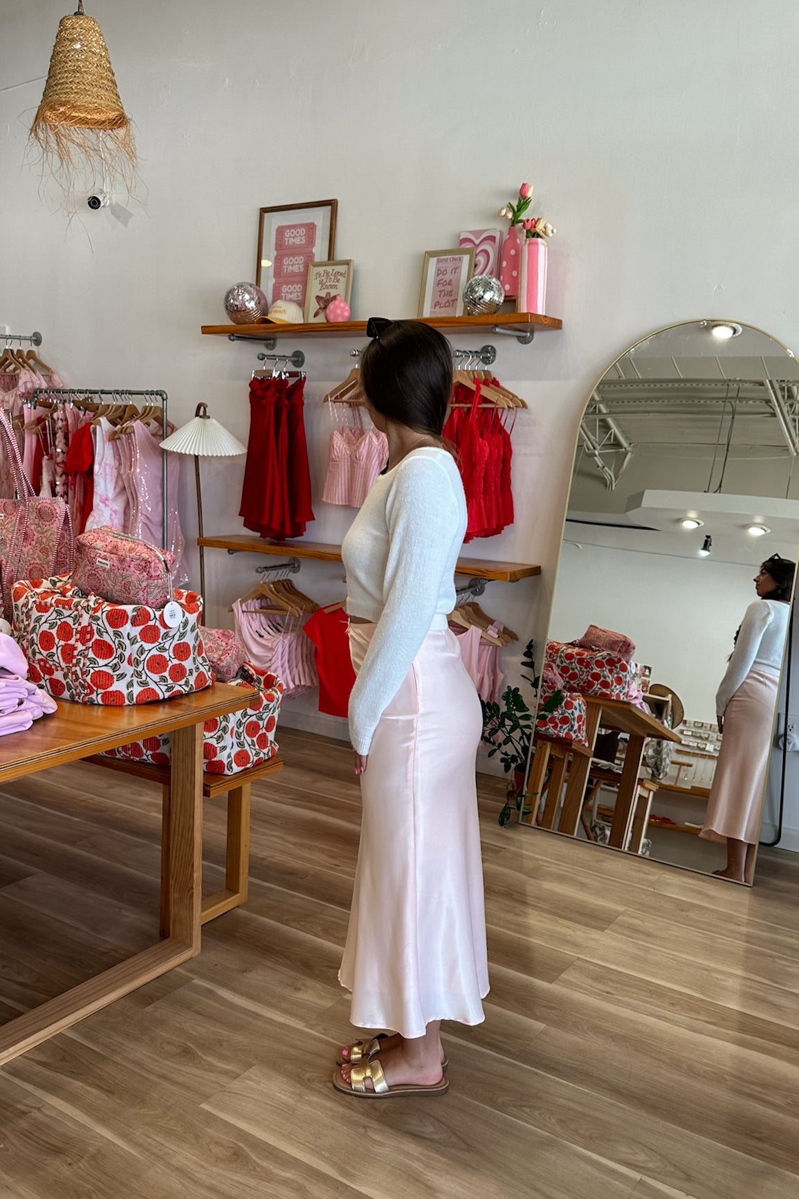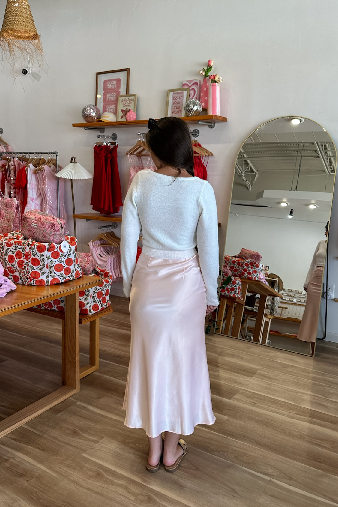 Pink, satin midi skirt with A-line cut, front bow, scalloped edge, elastic waistband, and lining