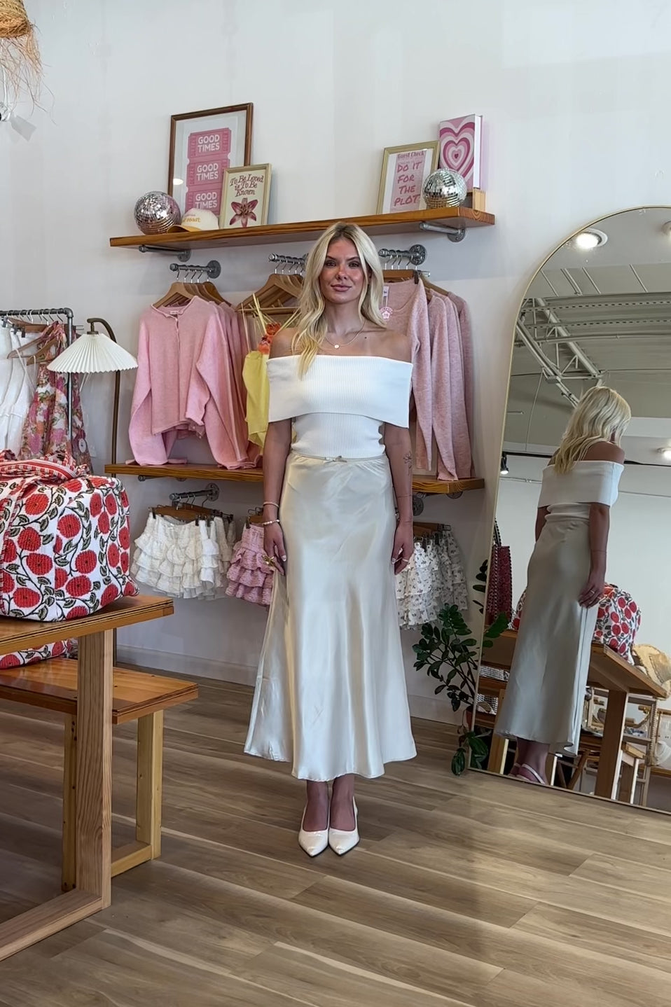 Tan, satin midi skirt with A-line cut, front bow, scalloped edge, elastic waistband, and lining