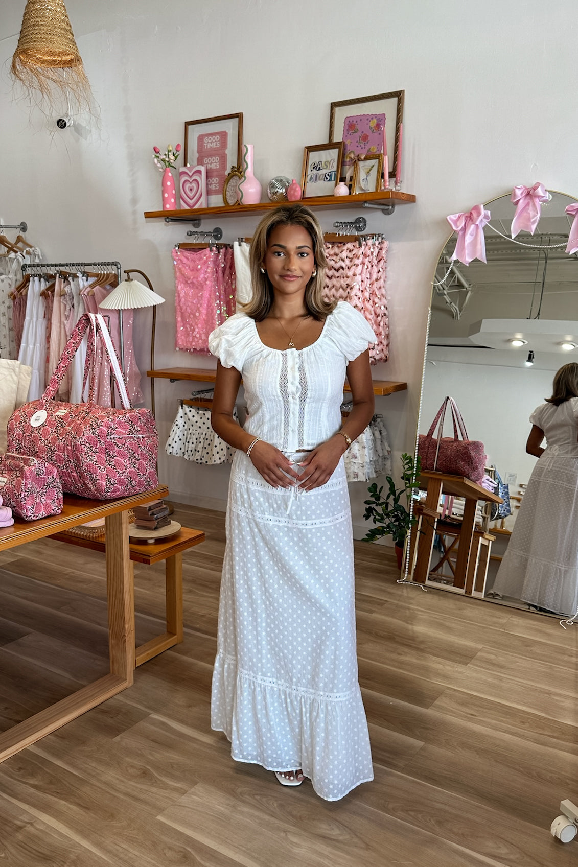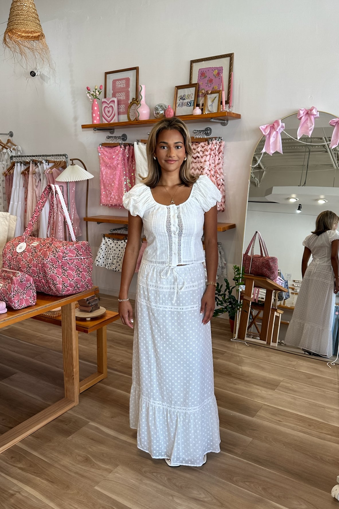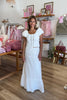 White, eyelet maxi skirt with lace tiers, elastic waist, drawstring tie, and lining