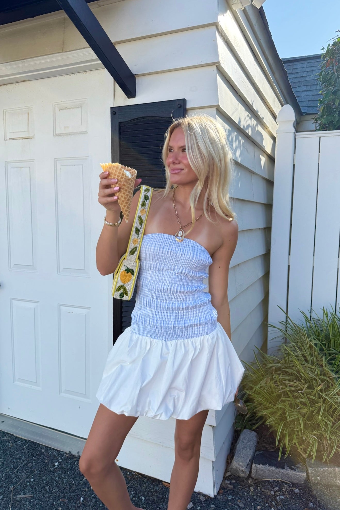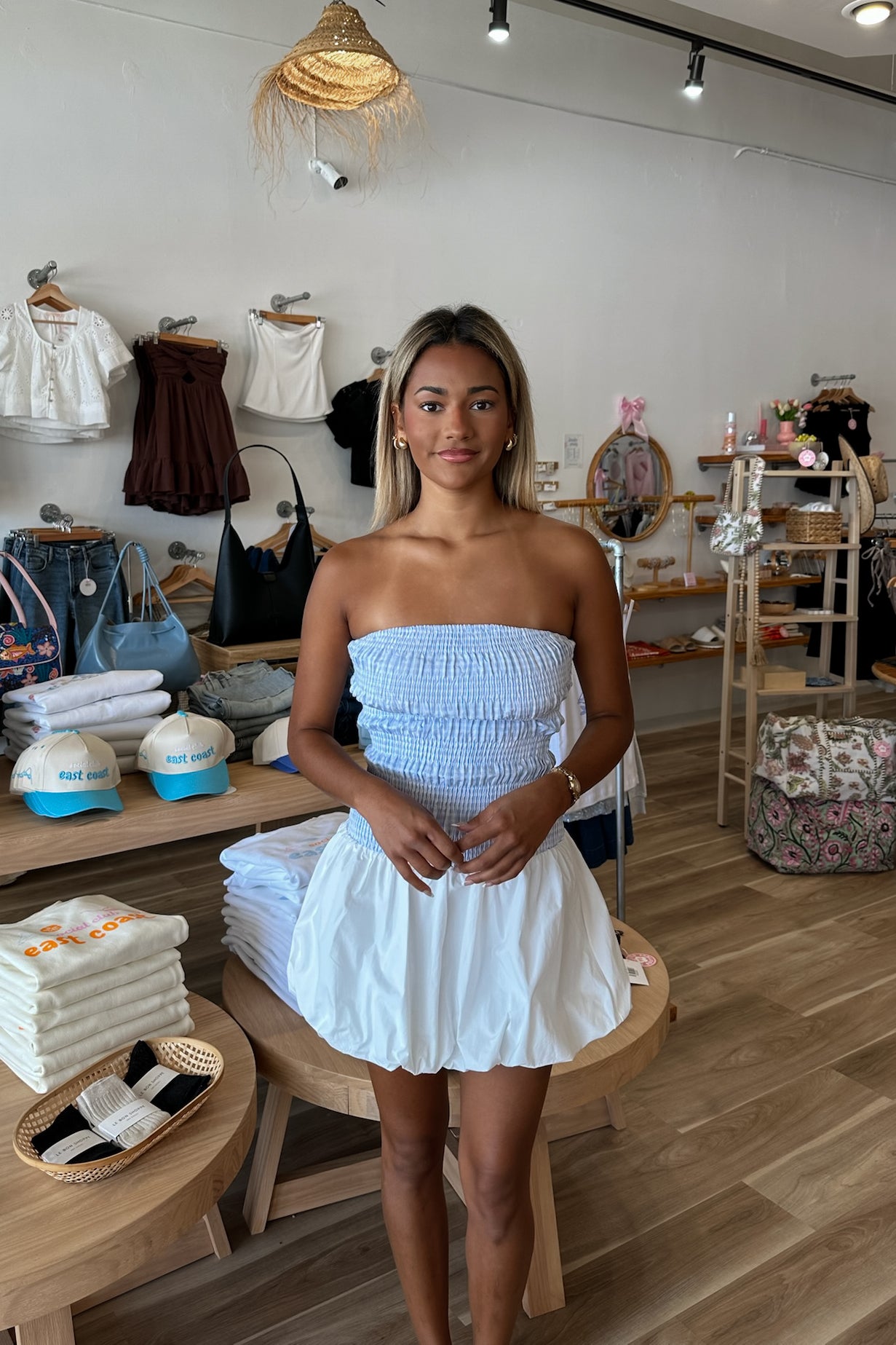 Blue, gingham color block dress with strapless neckline, smocked bodice, and bubble hem