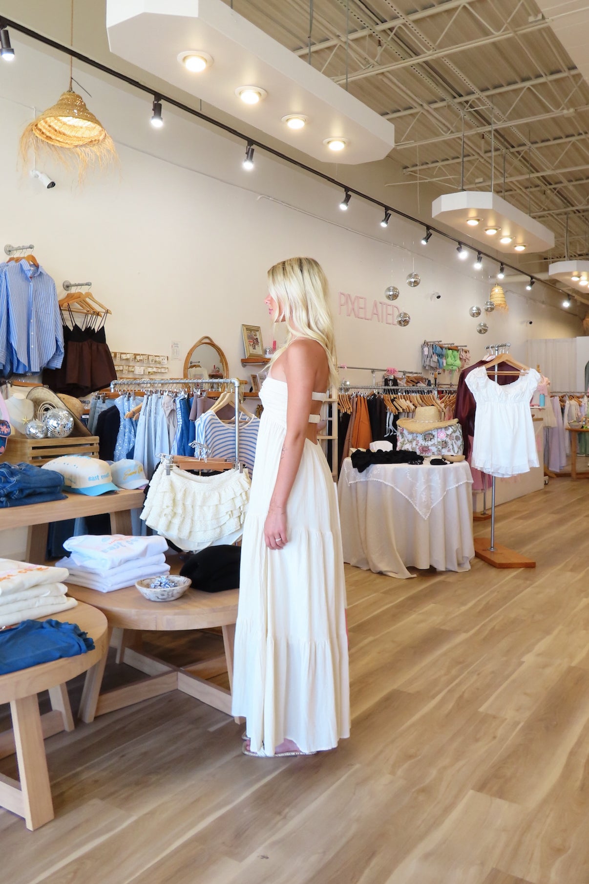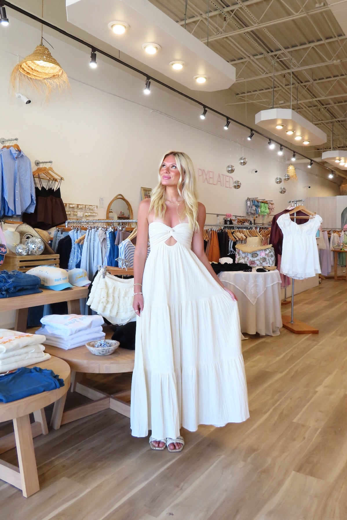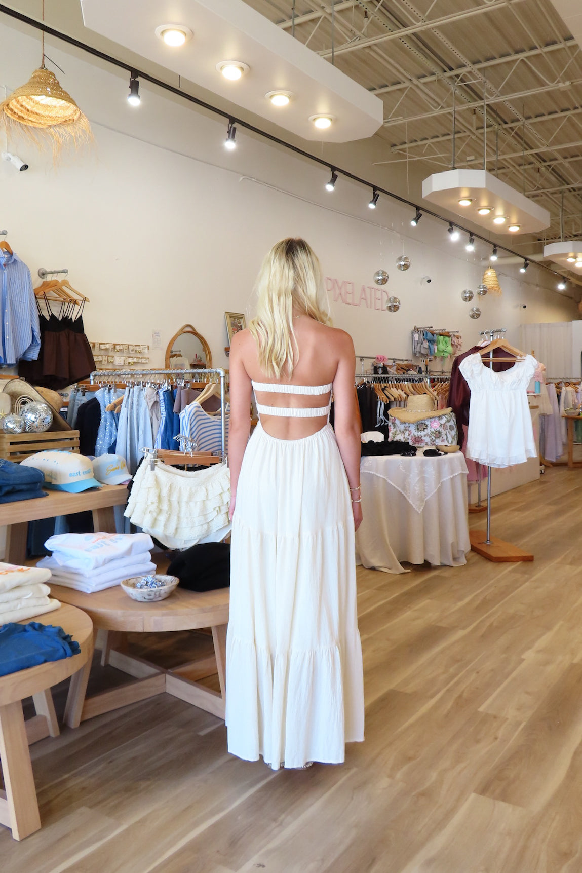 Beige, strapless maxi dress with twisted bust, center cutout, and double elasticated back straps