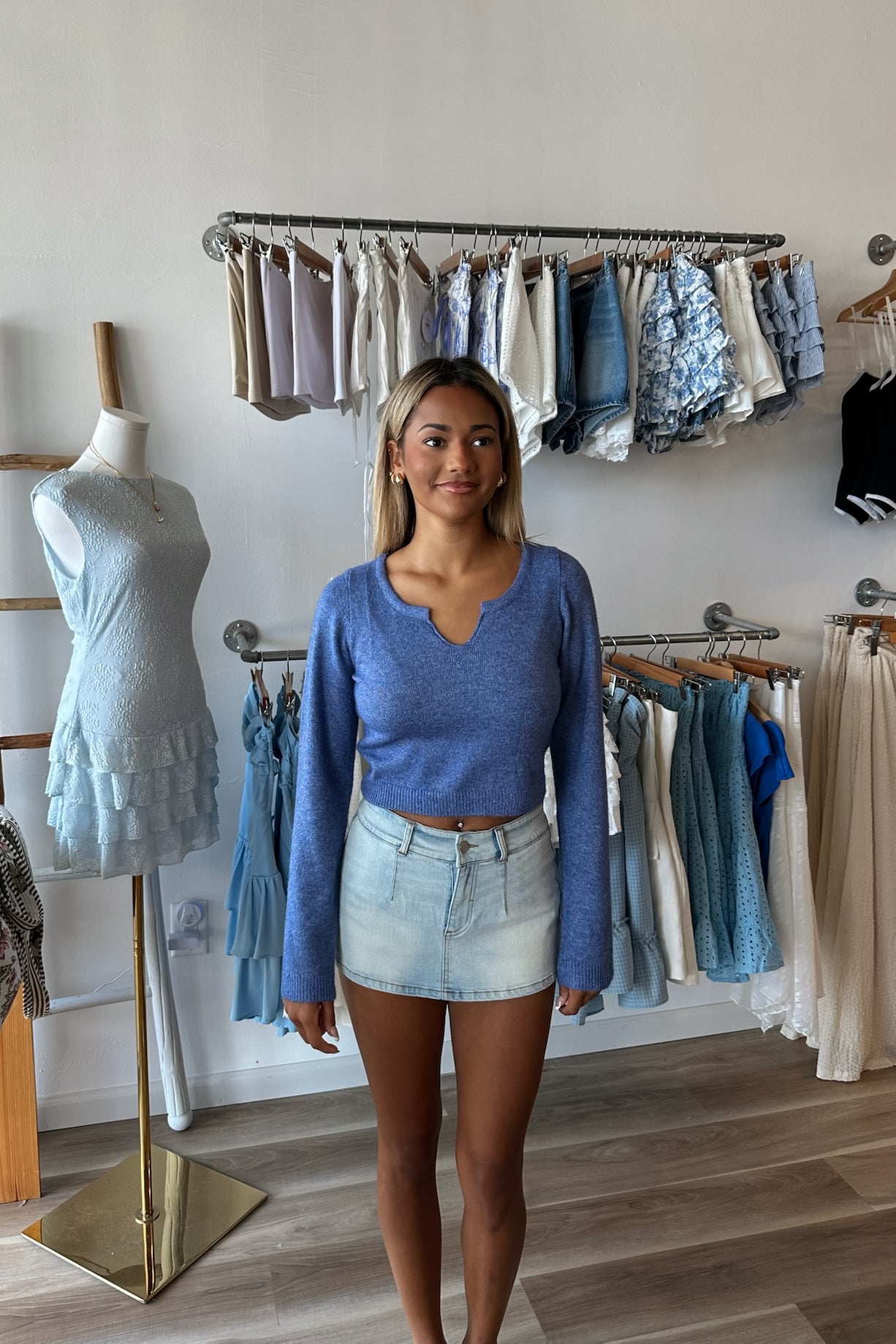 Blue, knit top with round neckline, long sleeves, hole point, and cropped length