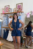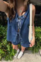 Blue, denim vest top with open front and ties and shorts with elastic waist and pockets