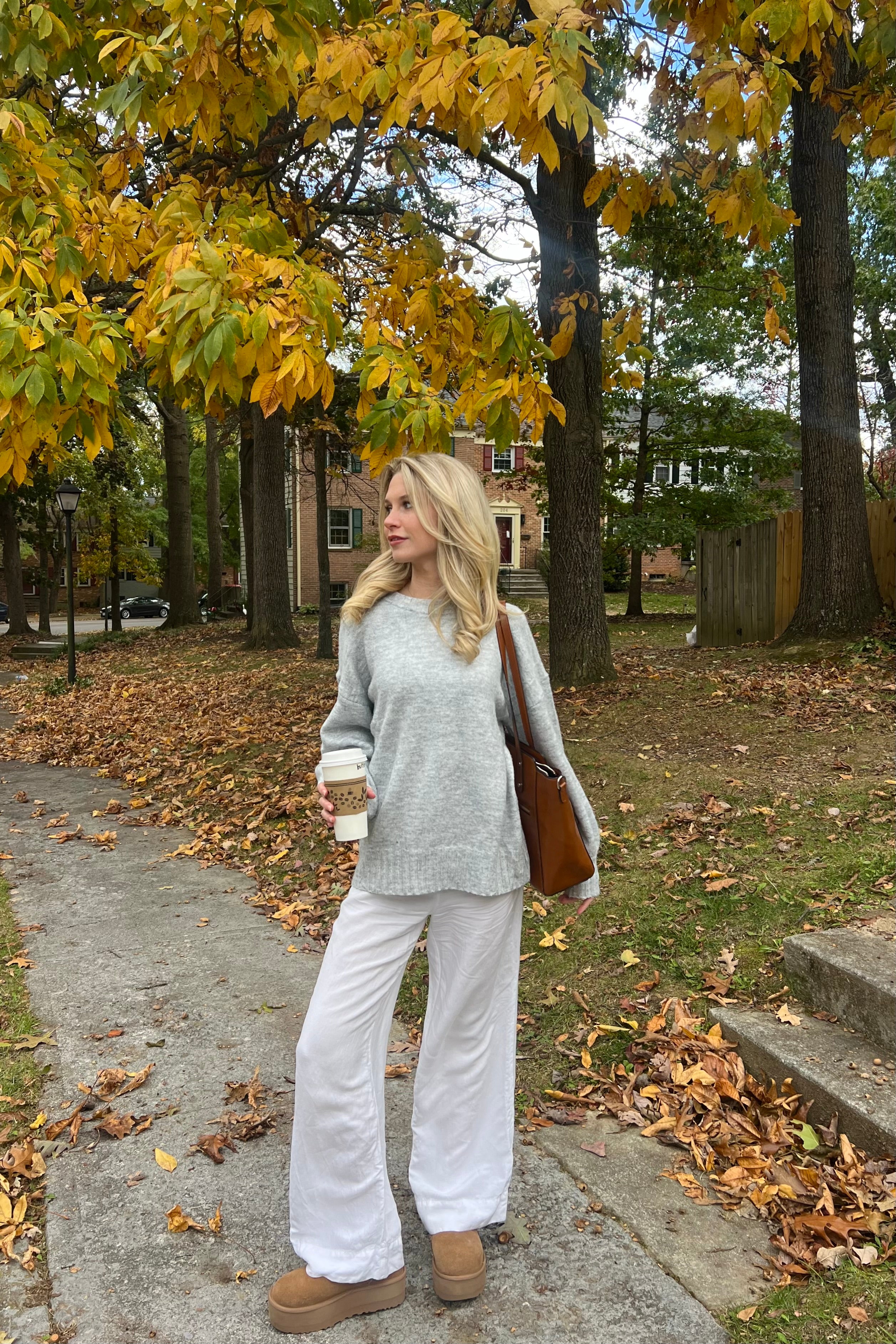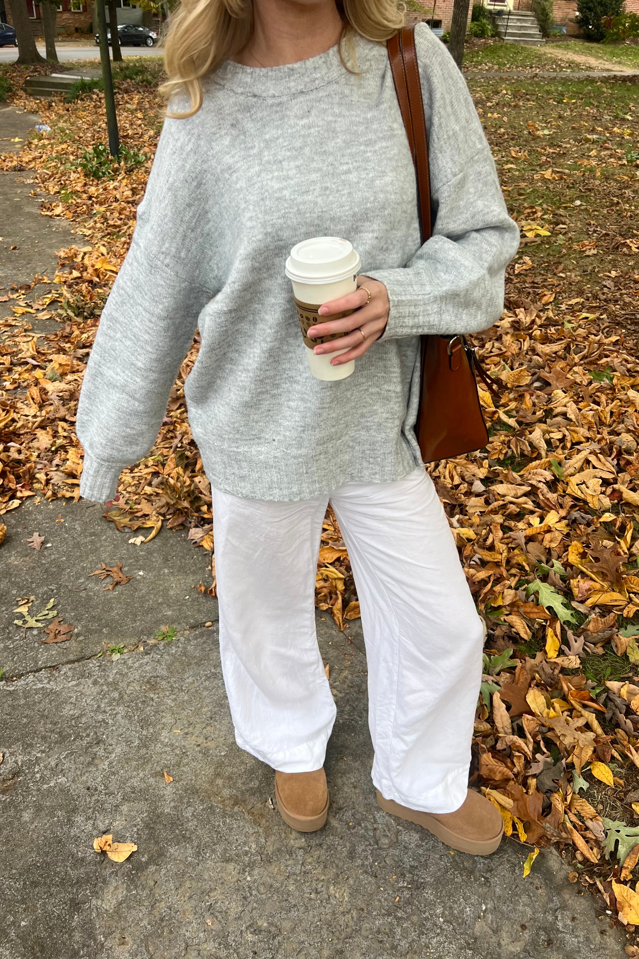 Gray, oversized sweater with ribbed hems, balloon sleeve, and mock neck