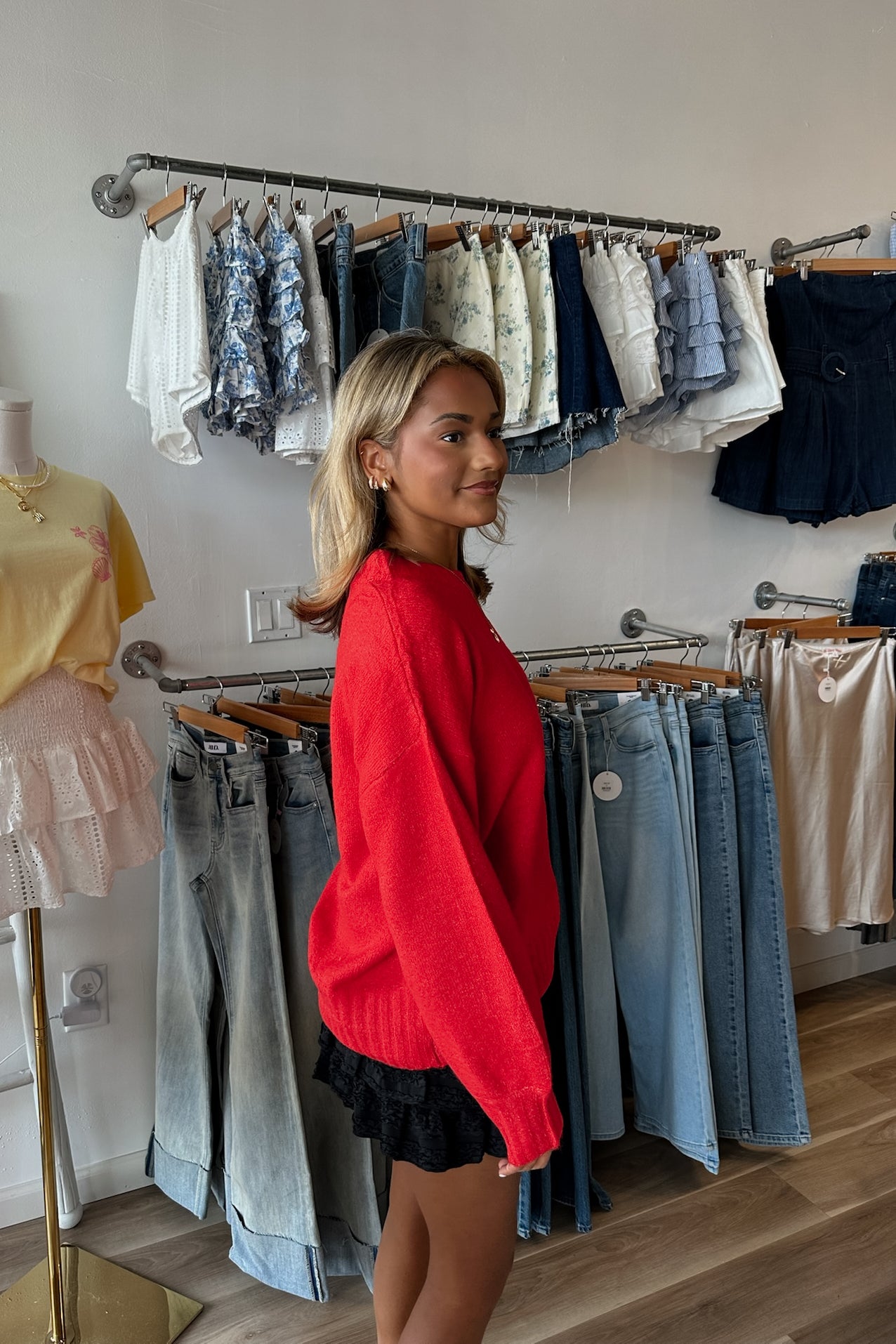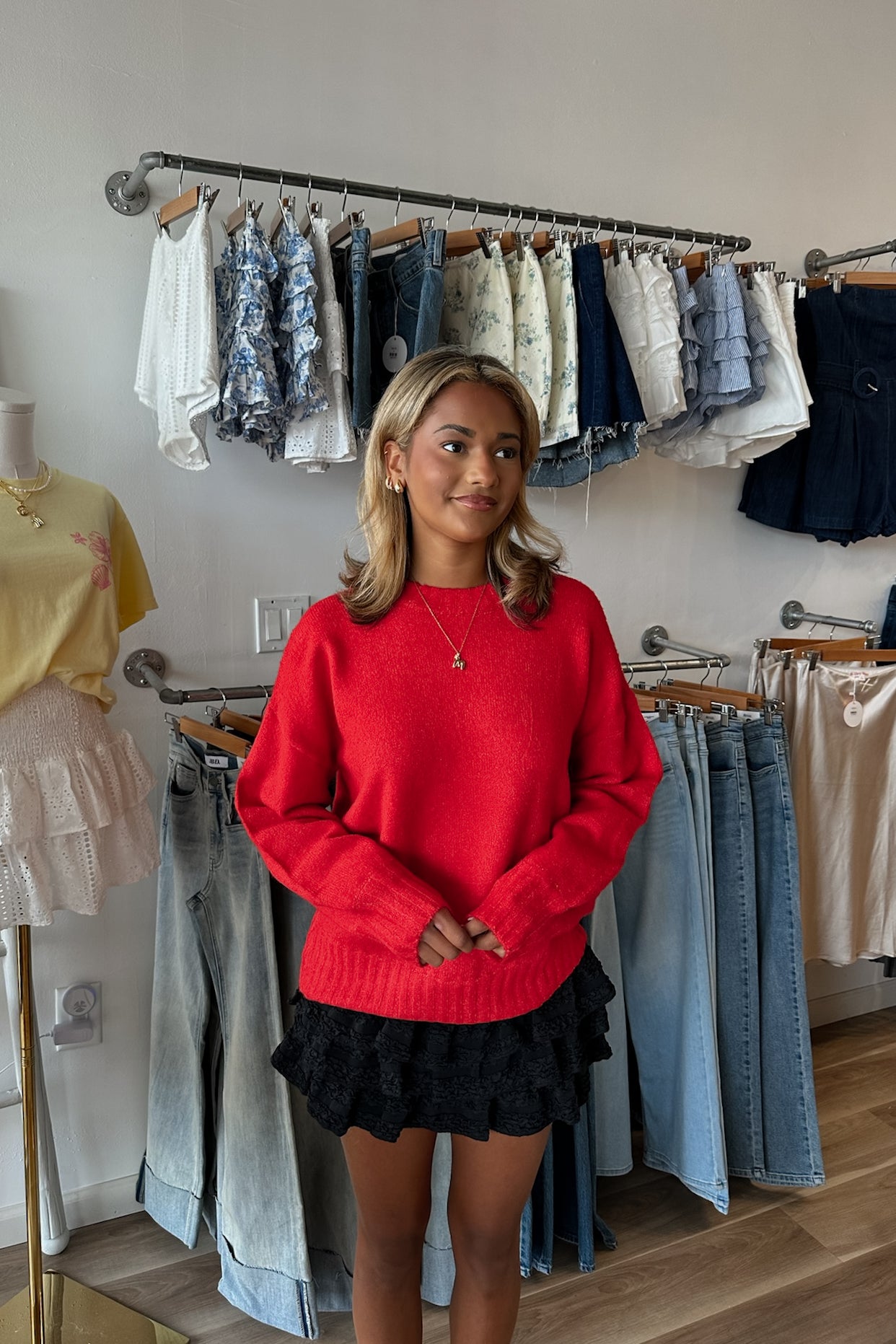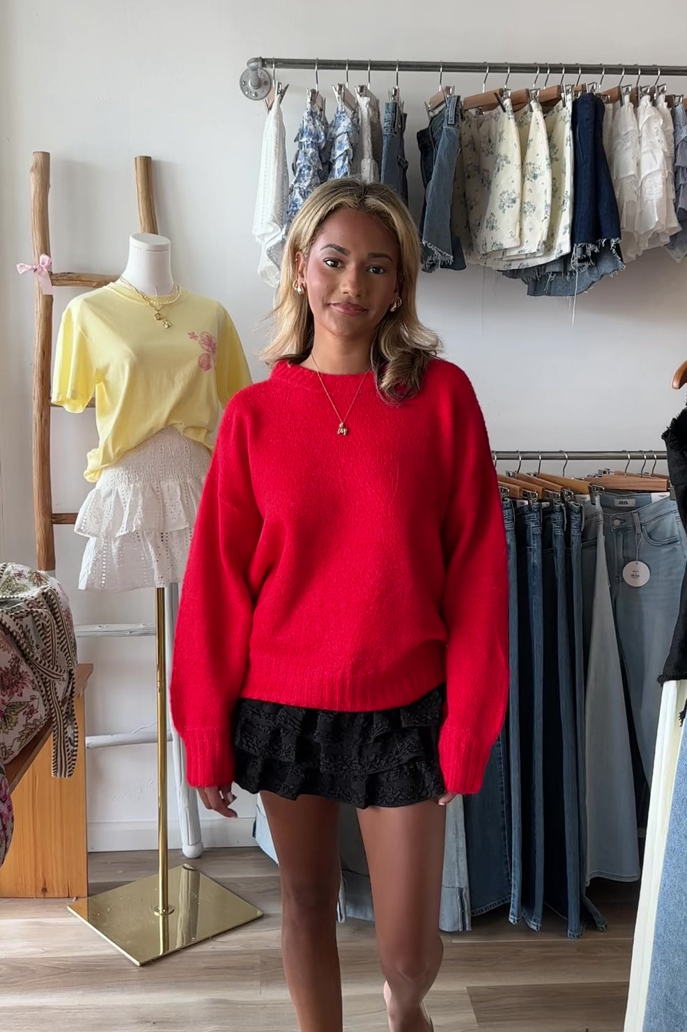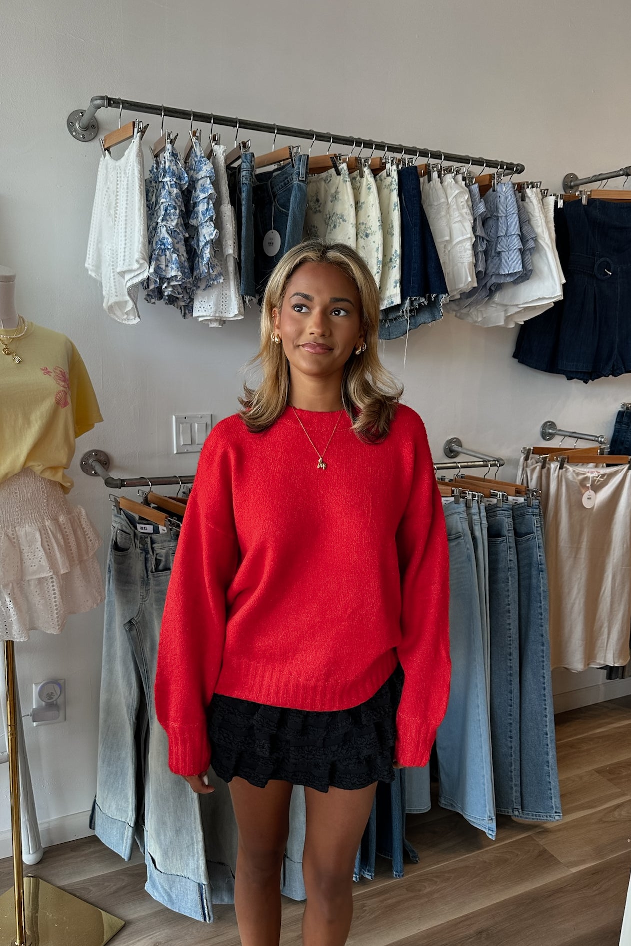 Red, oversized sweater with ribbed hems, balloon sleeve, and mock neck