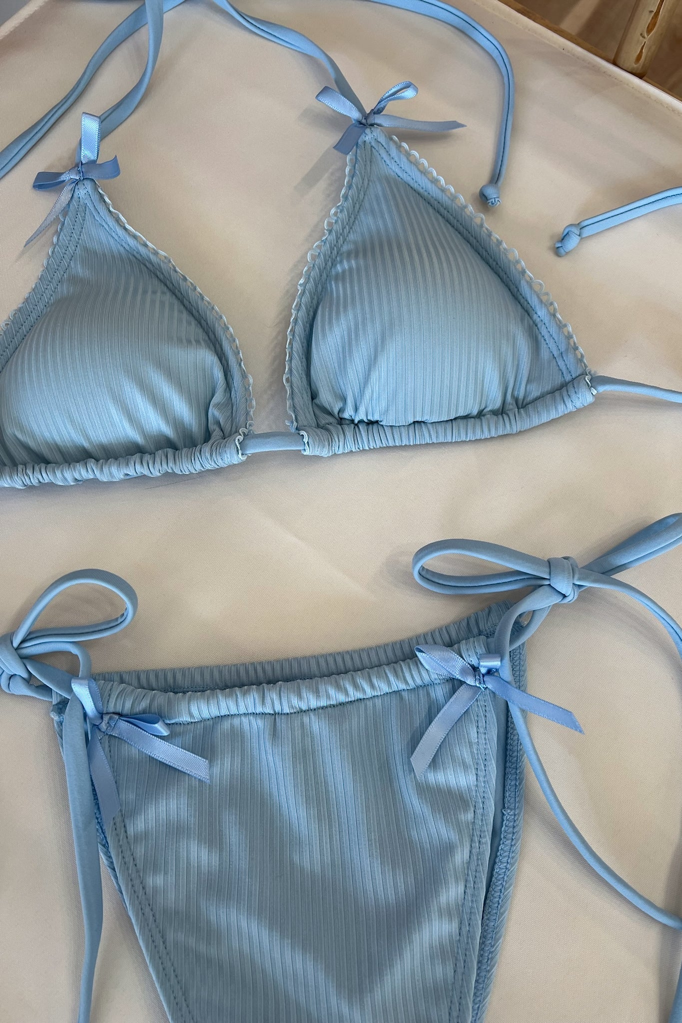 Blue, cheeky fit bikini bottoms with adjustable strings