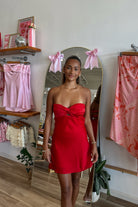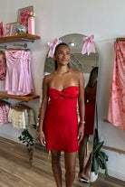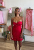 Red, strapless satin mini dress with twisted bust, center cutout, cowl back, and double elasticated back straps