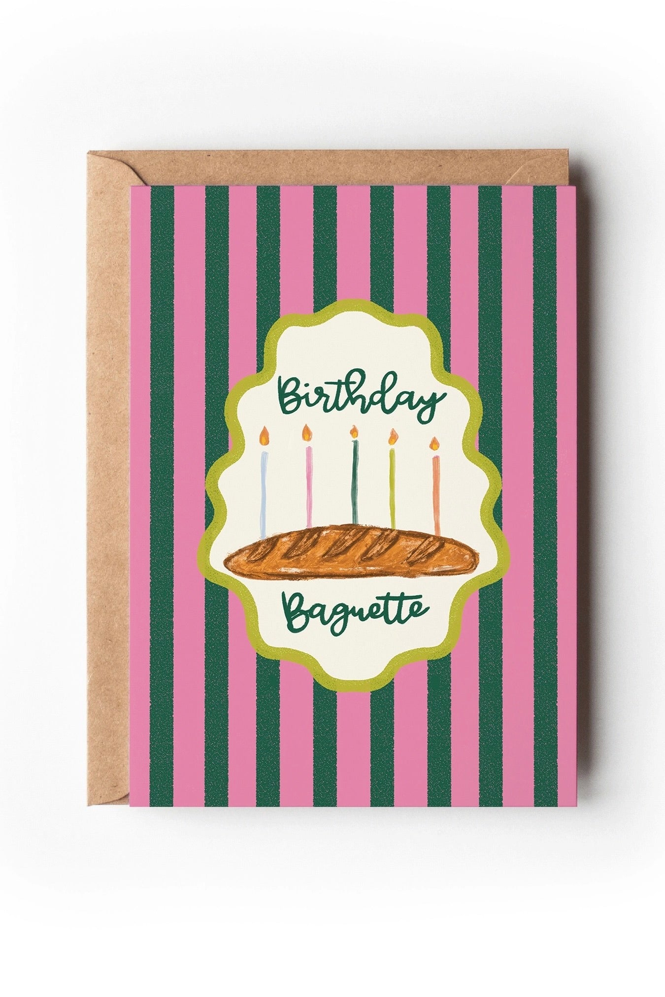 A7 greeting card with baguette and colorful candles original artwork by artist