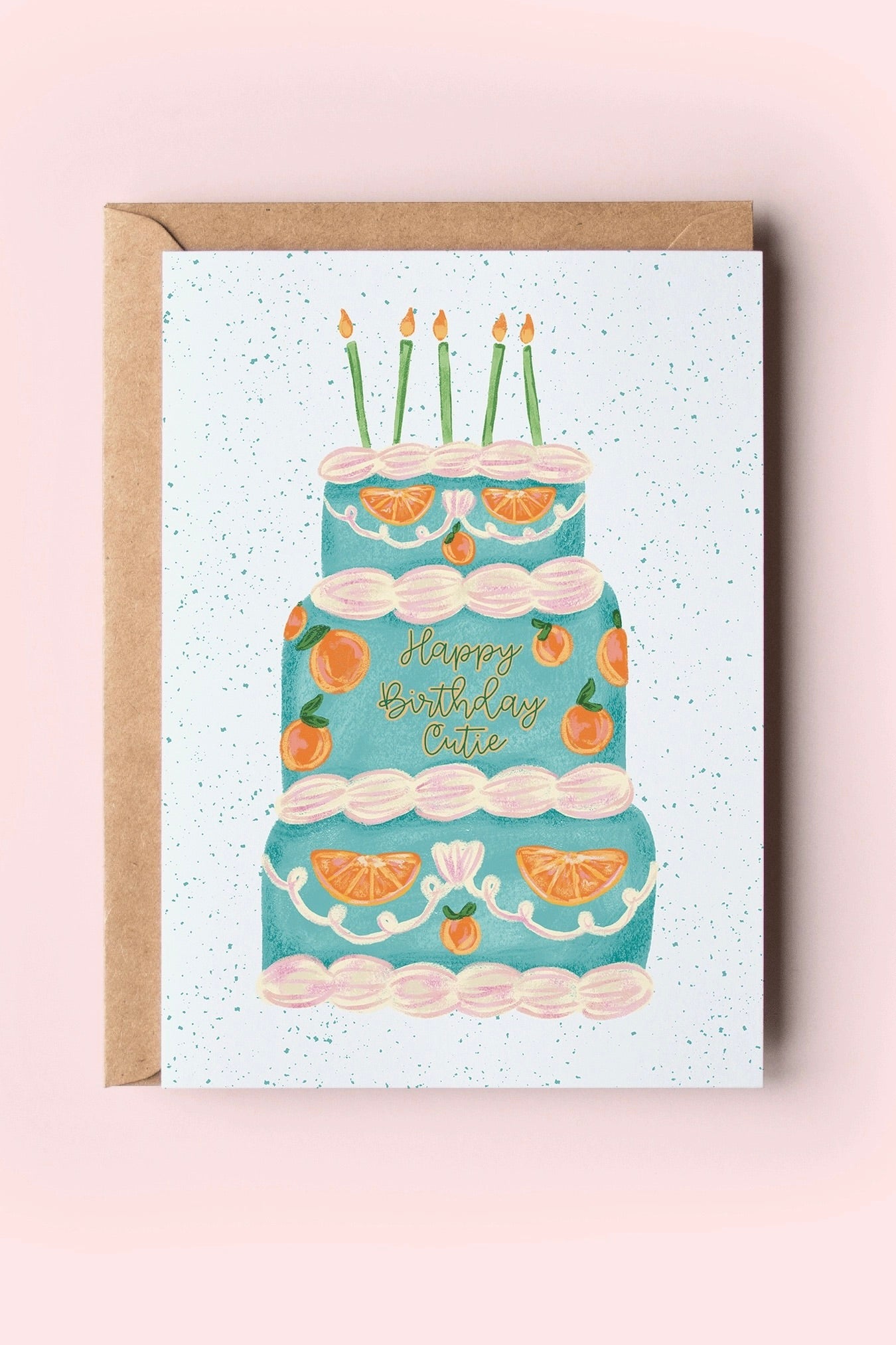 A7 greeting card with birthday cake and oranges original artwork by artist