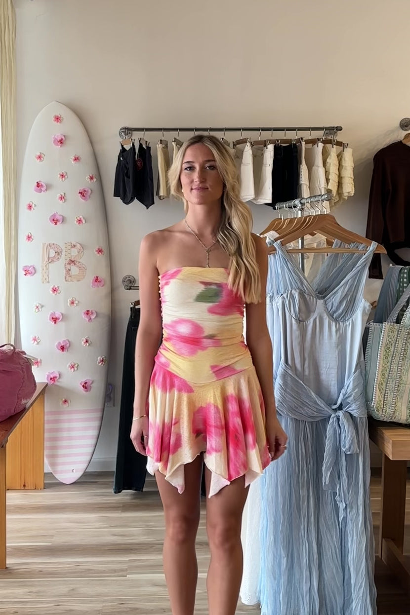 Pink, floral strapless mini dress with ruched bodice, asymmetric hem, and inside shorts