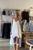 White, textured mini dress with V neckline, embroidered bust, smocked back, and frayed hem