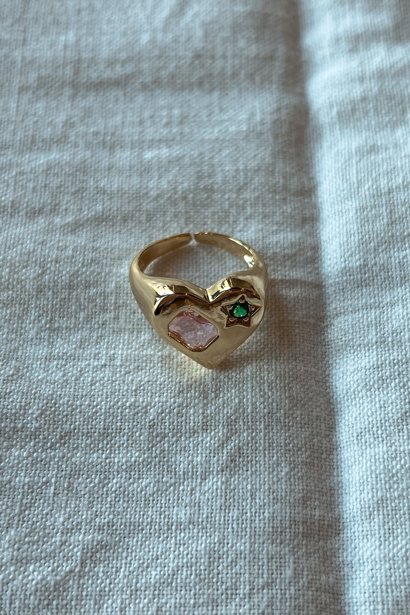 Gold, heart signet ring with pink & green Cubic Zirconia baguette stones