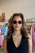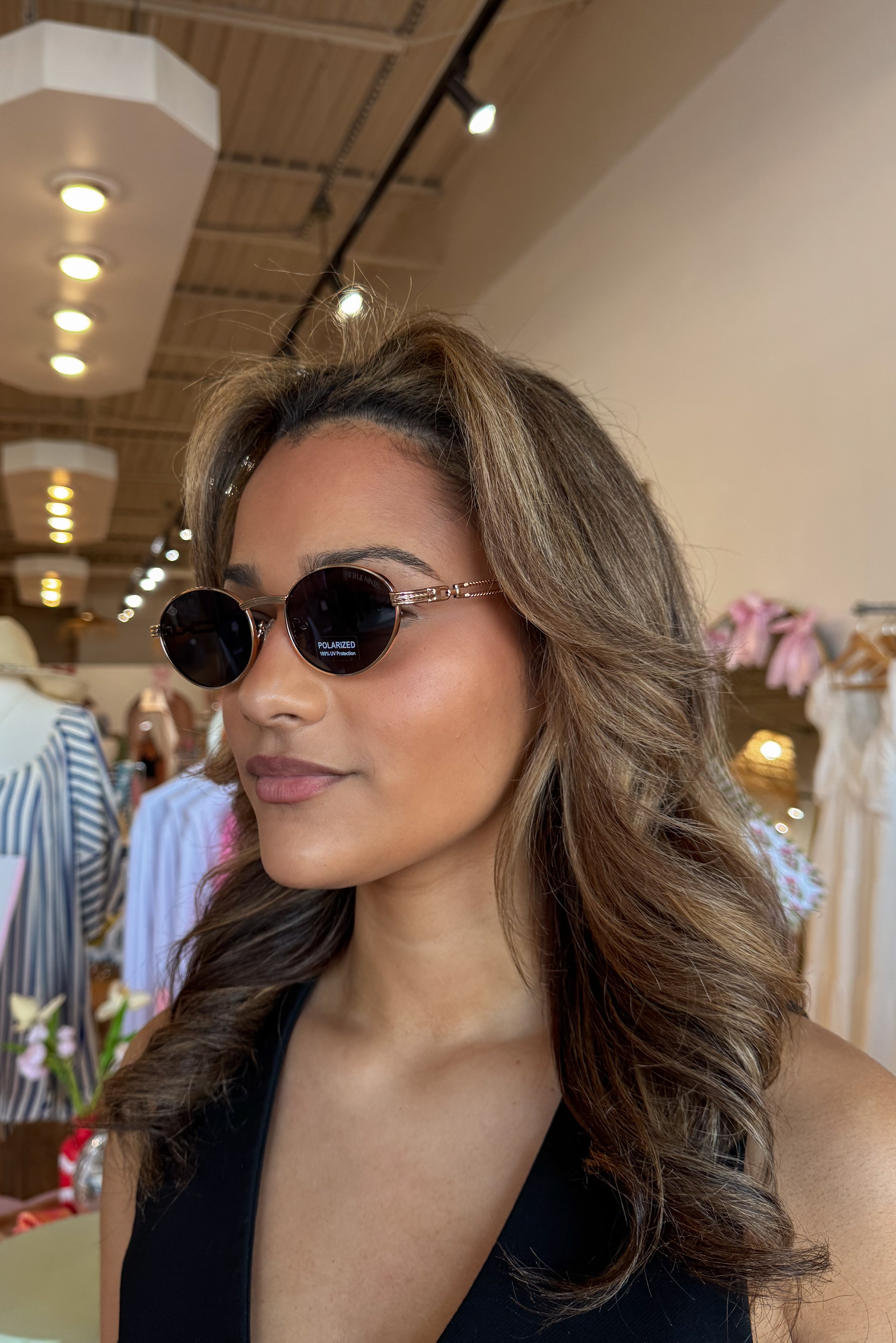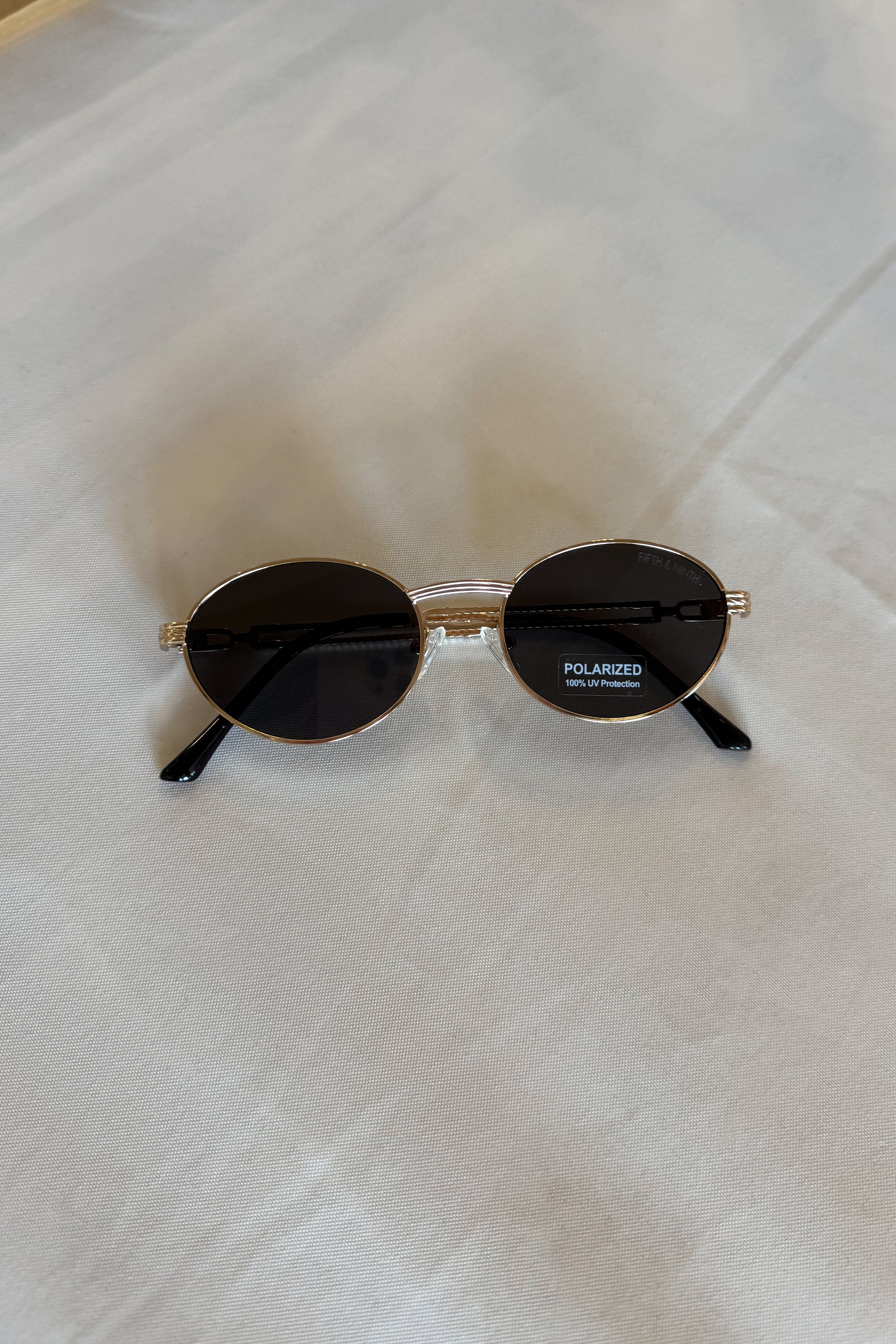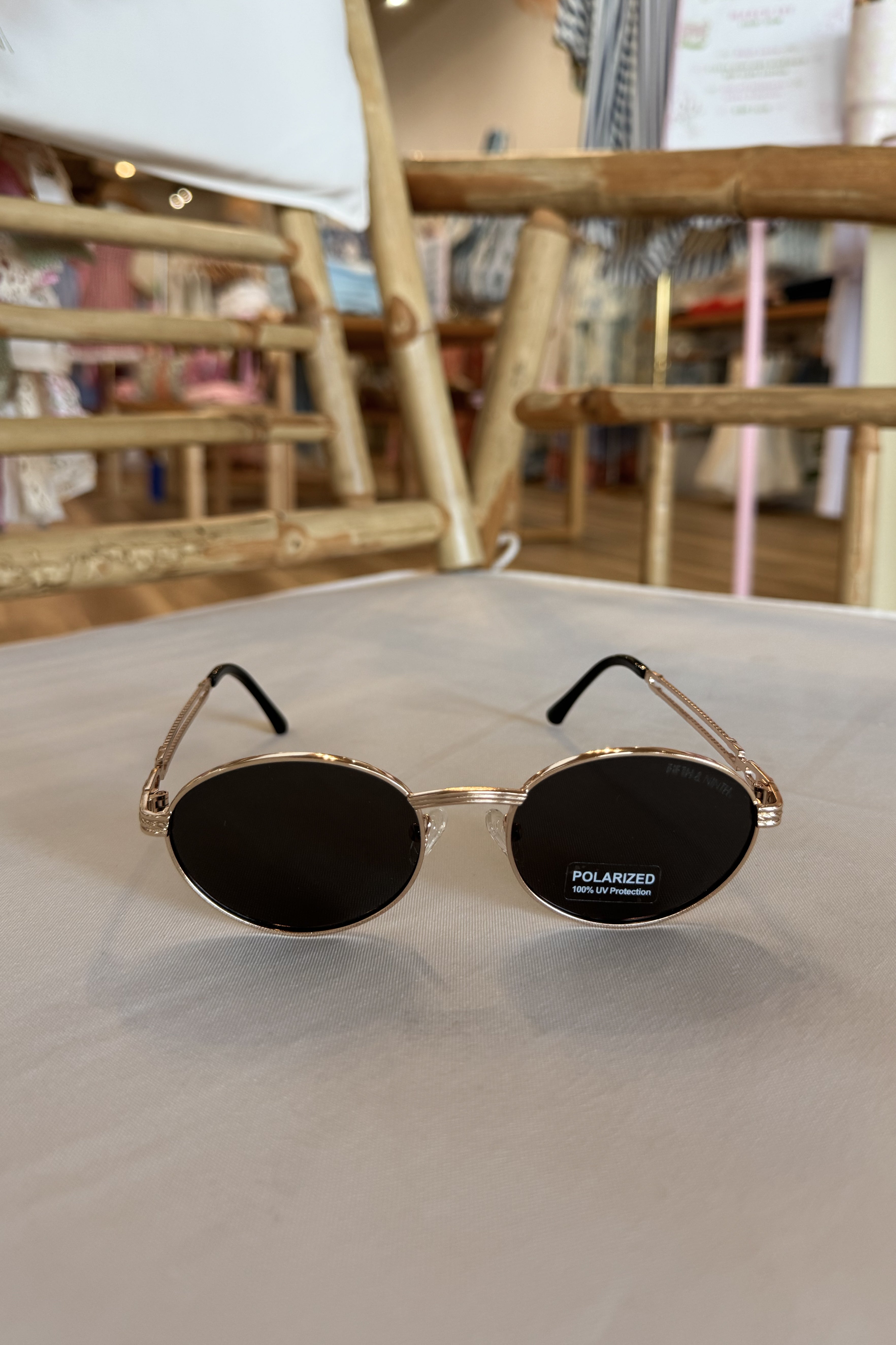 Polarized sunglasses with oval shape and unique leg design. These sunnies feature a high-quality frame with glare-reducing polarized lenses and 100% UV protection.