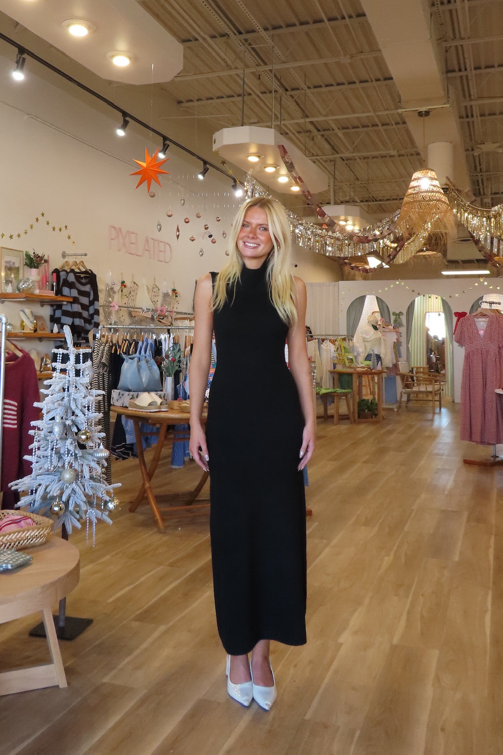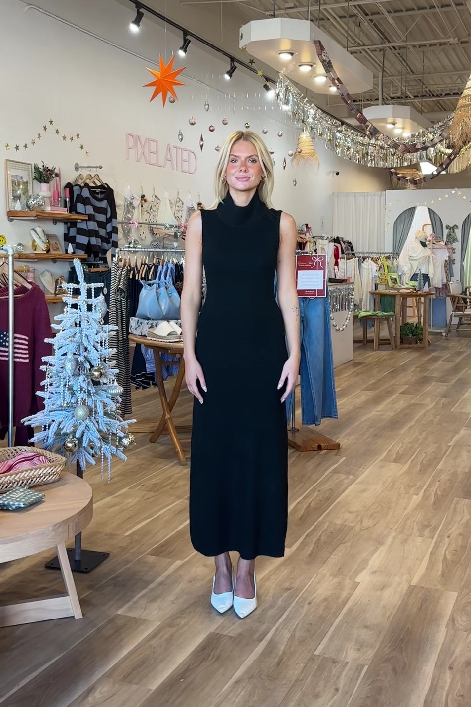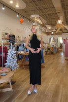 Black, knit maxi dress with mock neckline, body conscious fit, and open back with spaghetti straps