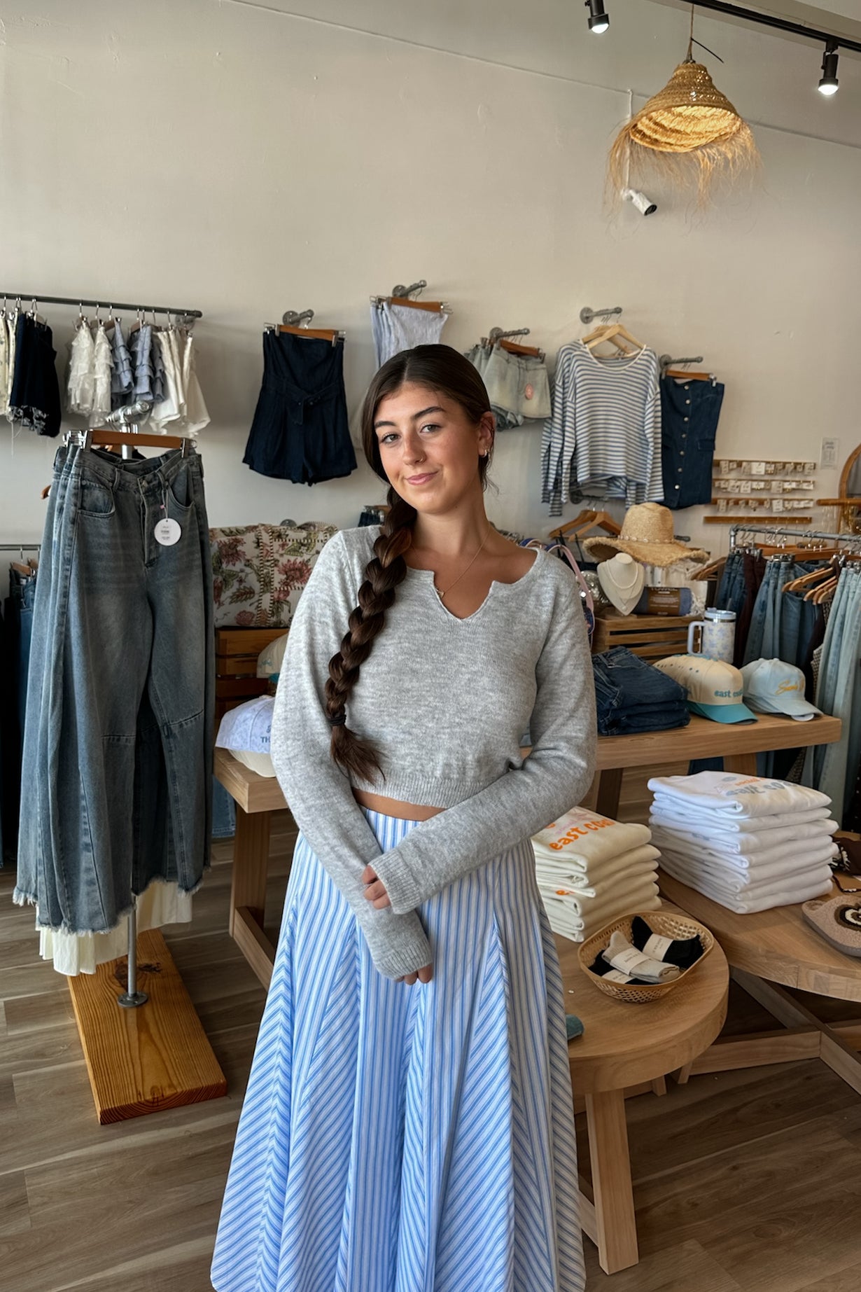 Gray, knit top with round neckline, long sleeves, hole point, and cropped length